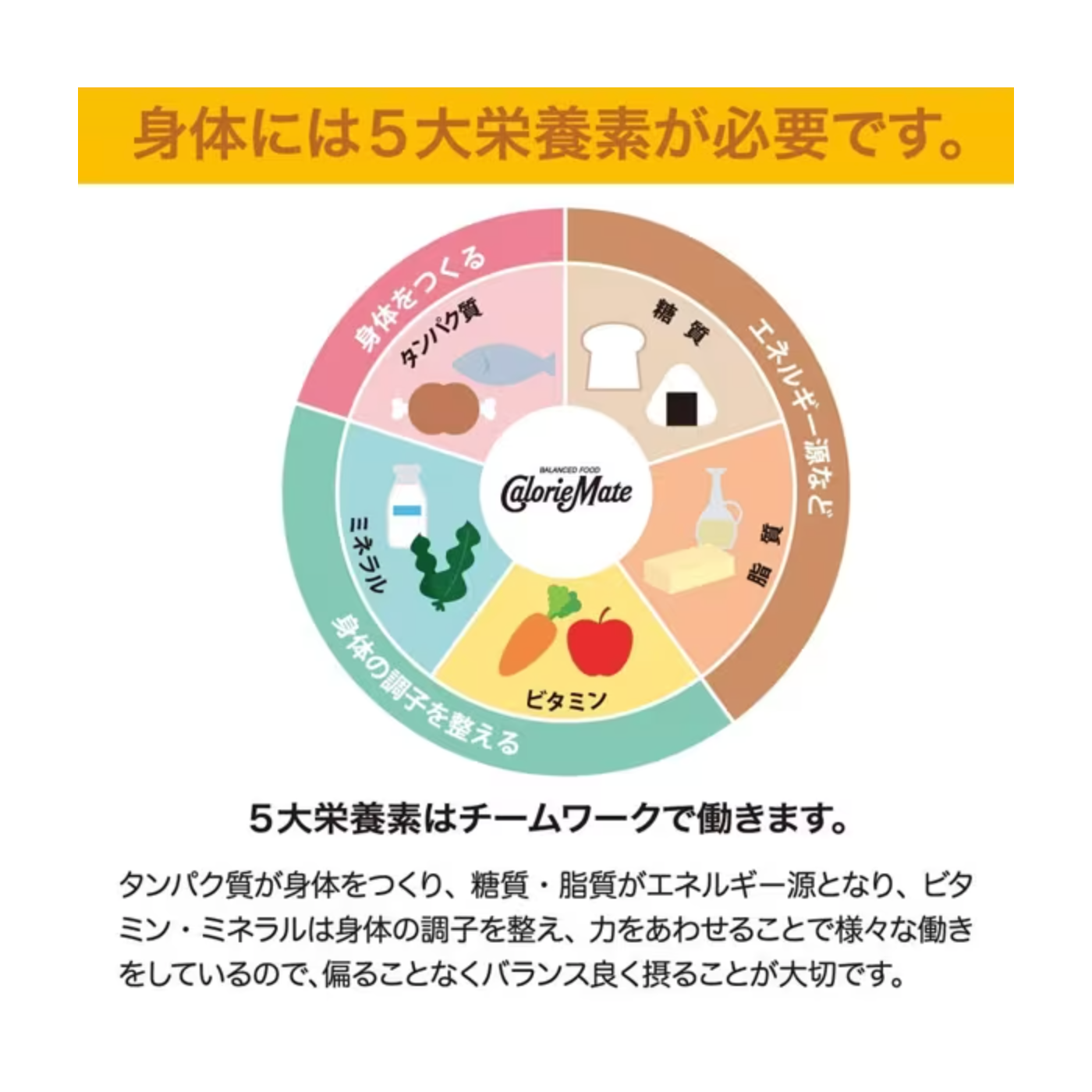 均衡含有5種主要營養素的營養食品。