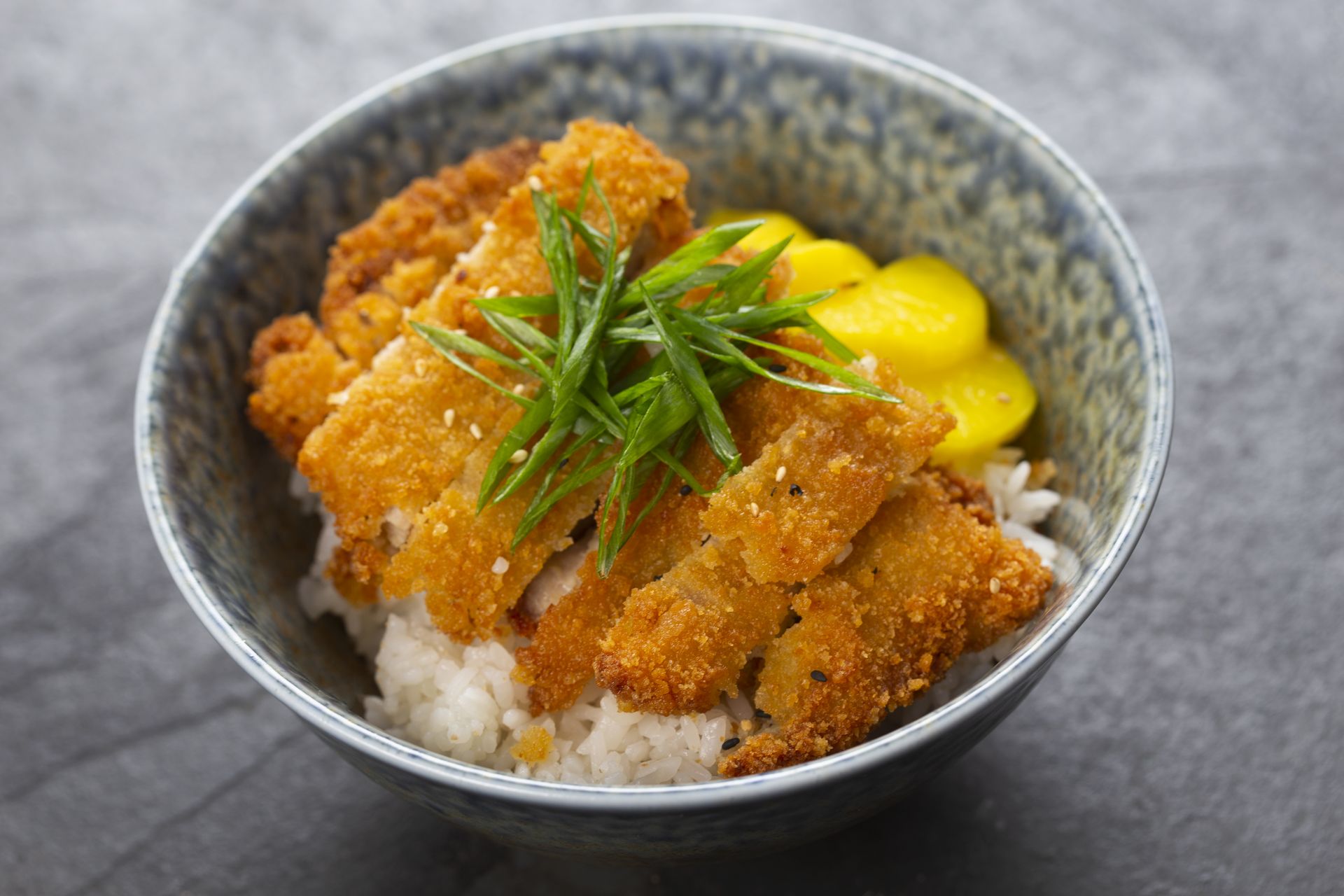 Ingredients: Breaded chicken cutlet, tonkatsu sauce, steamed white rice, shredded cabbage, carrot, sesame seeds