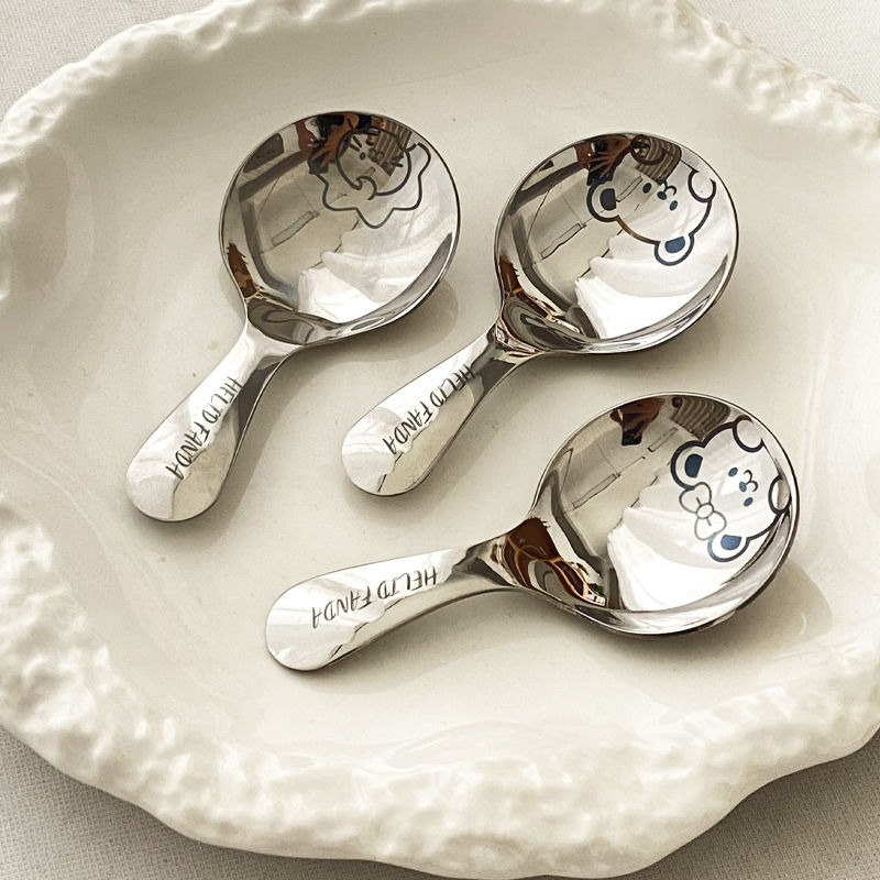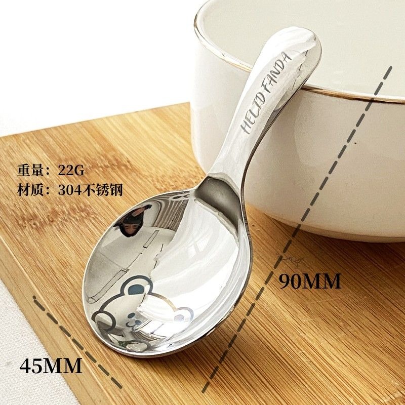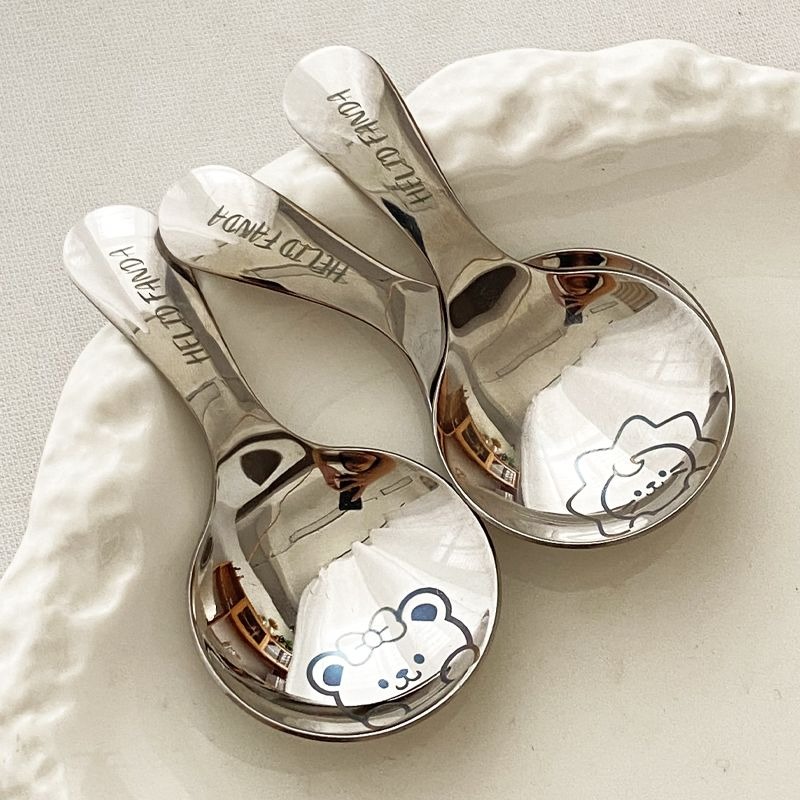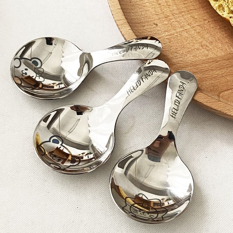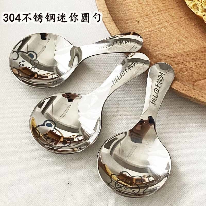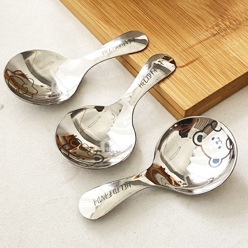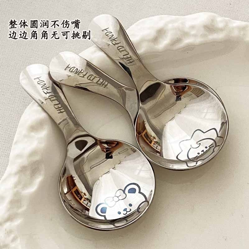 不鏽鋼304短柄圓勺家用便攜式餐勺甜品勺調味勺兒童創意可愛飯勺(小熊款圓勺 本色 1個) 1 个