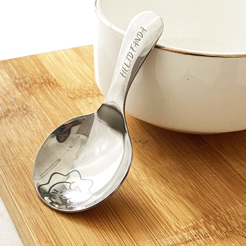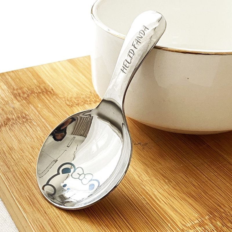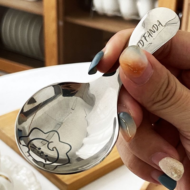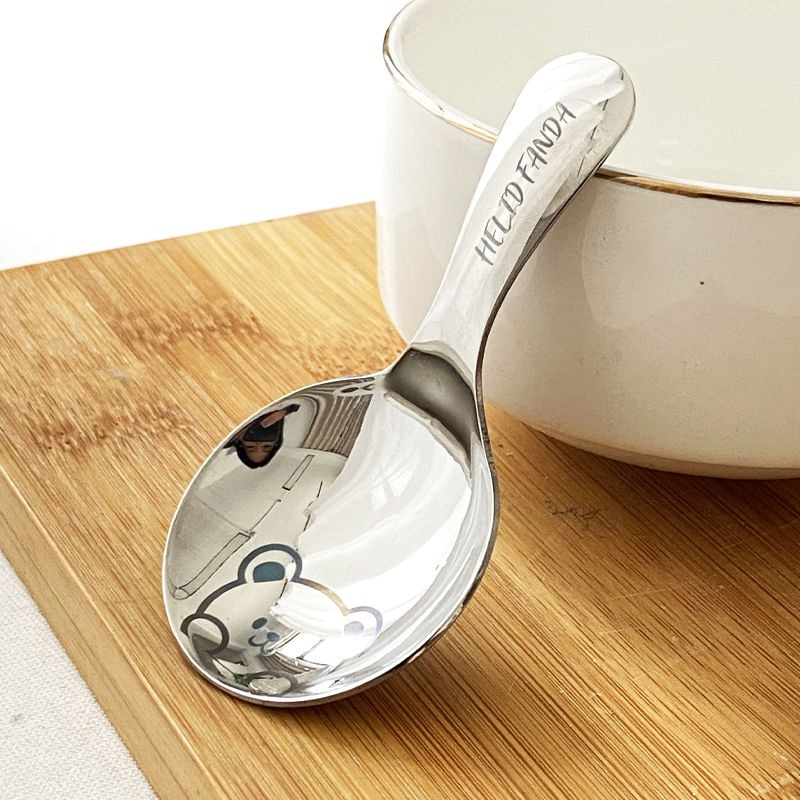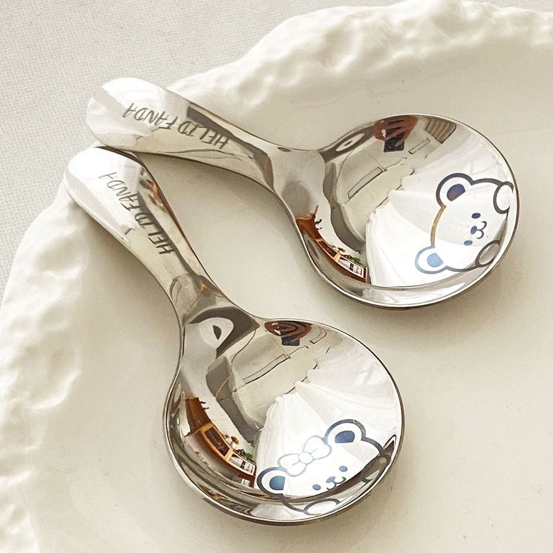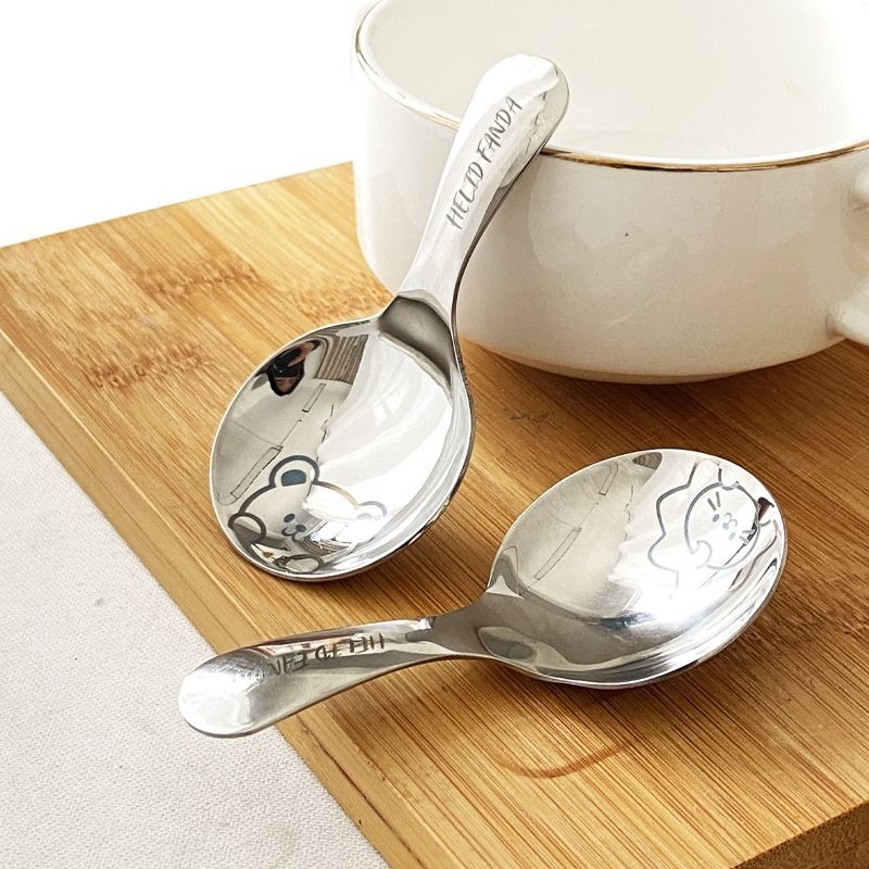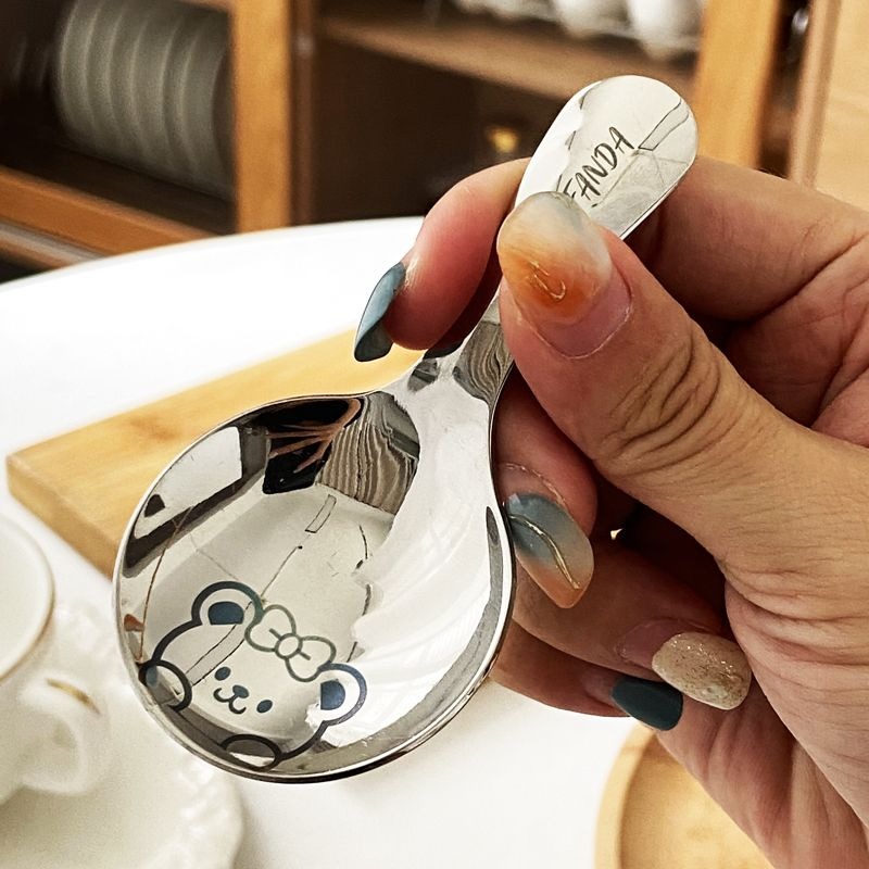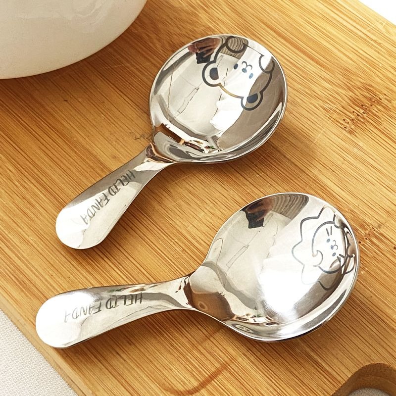 不鏽鋼304短柄圓勺家用便攜式餐勺甜品勺調味勺兒童創意可愛飯勺(小熊款圓勺 本色 1個) 1 个