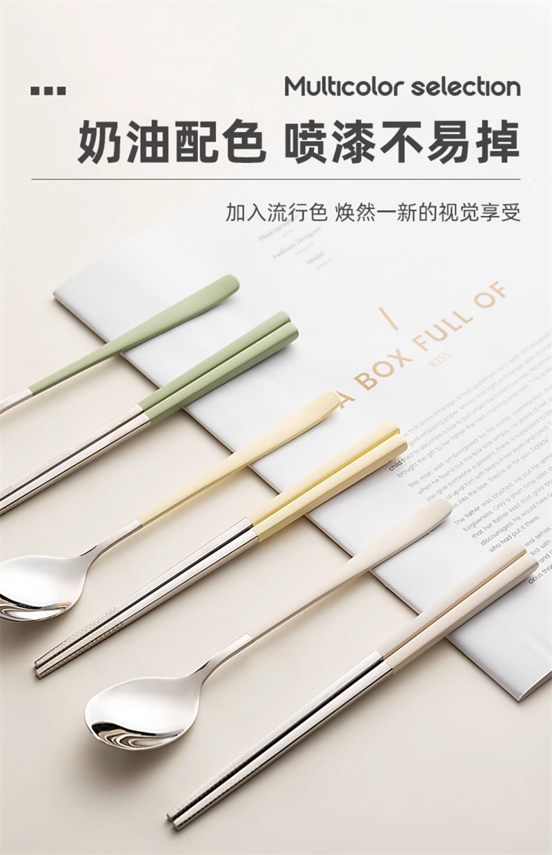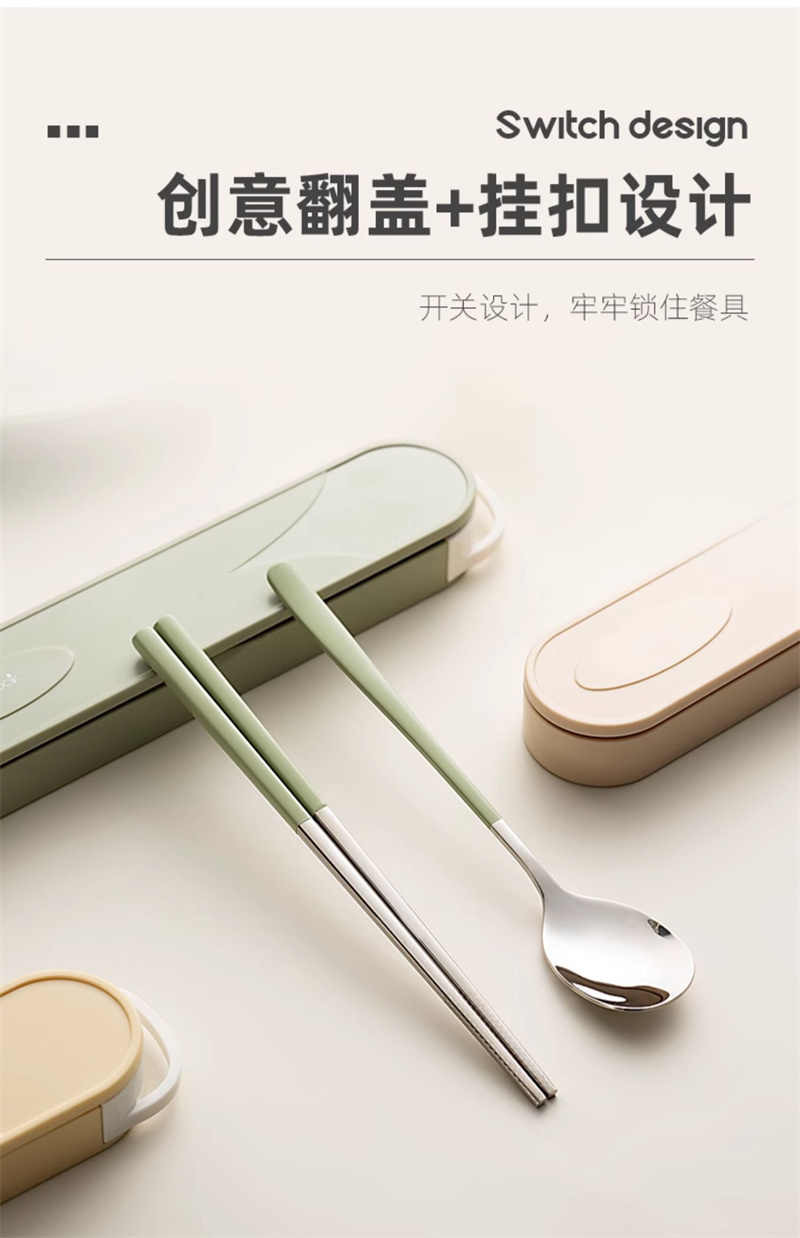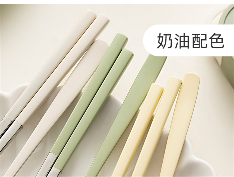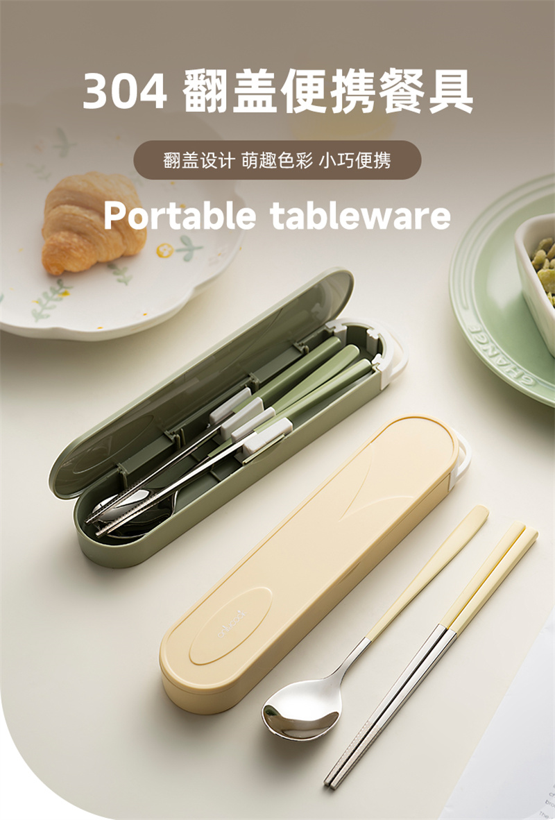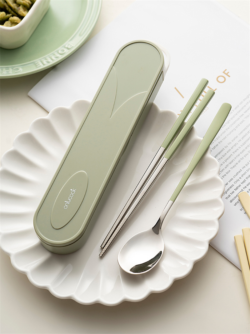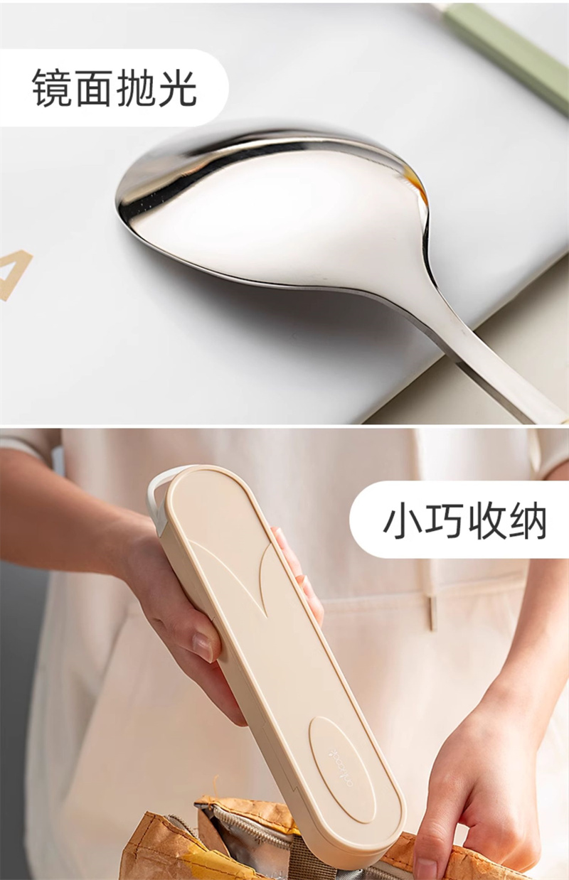 奶油色學生便攜餐具304不鏽鋼筷勺套裝 奶油綠 1 份