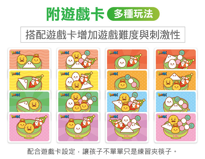 配合遊戲設定16種遊戲卡,讓孩子不單單只是練習夾筷子,搭配遊戲卡能增加遊戲難度與刺激性。