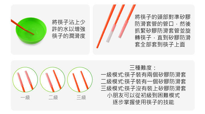 使用筷子,並附贈防滑套,操作簡單、貼近生活,讓孩子在遊戲中學習夾筷子。