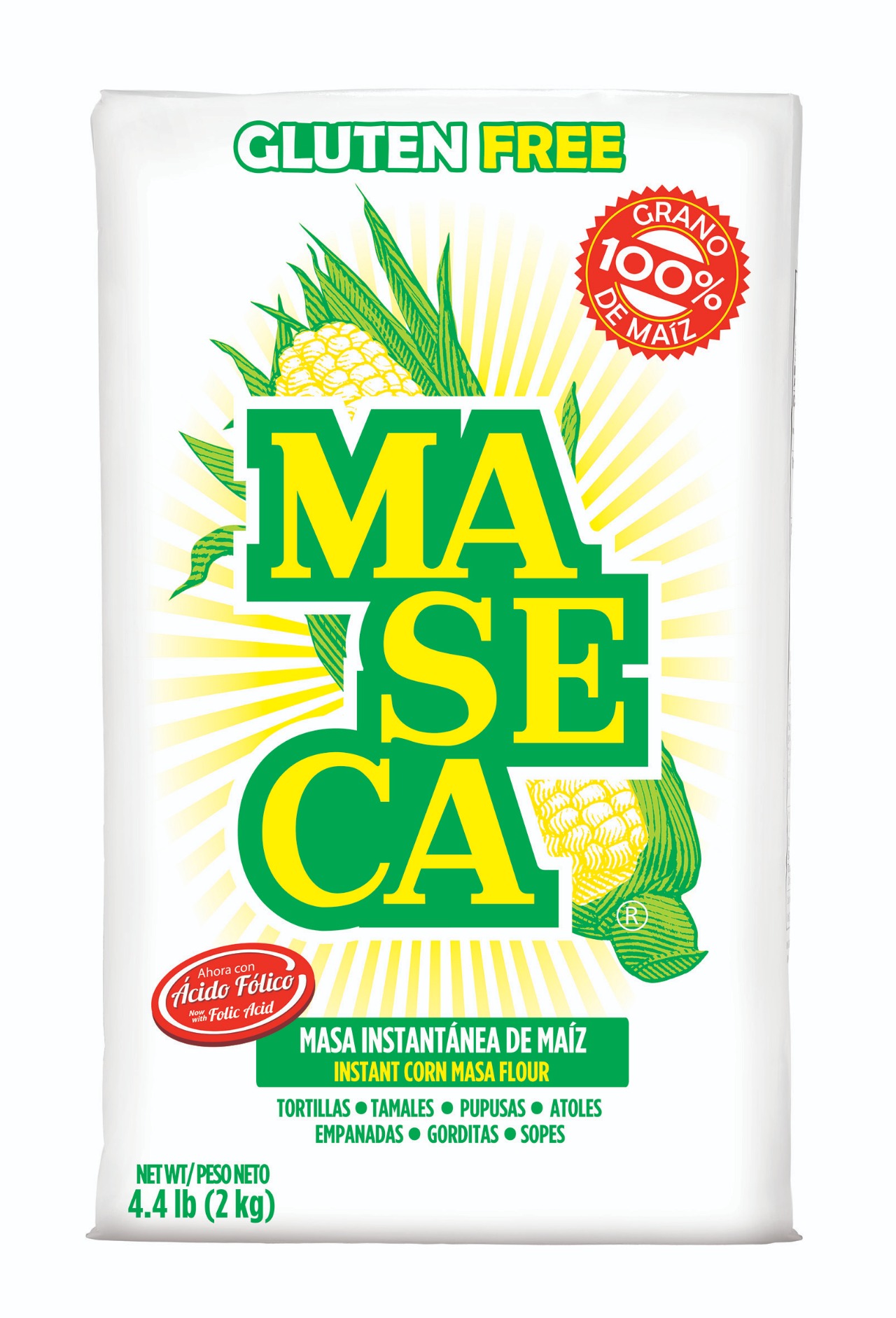 Ingredients: Corn treated with hydrated lime and folic acid.