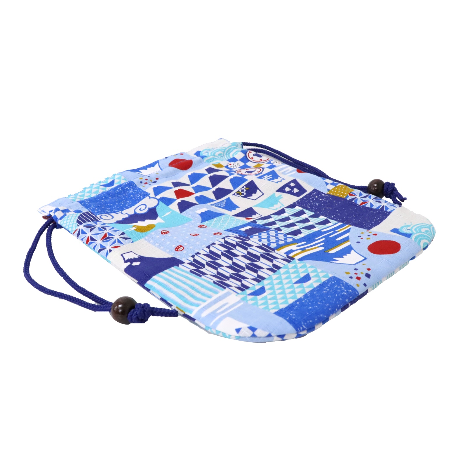 This medium-sized drawstring pouch features Mt. Fuji illustrations and silhouettes, together with traditional Japanese patterns such as checkered and yabane (arrow feather) motifs.