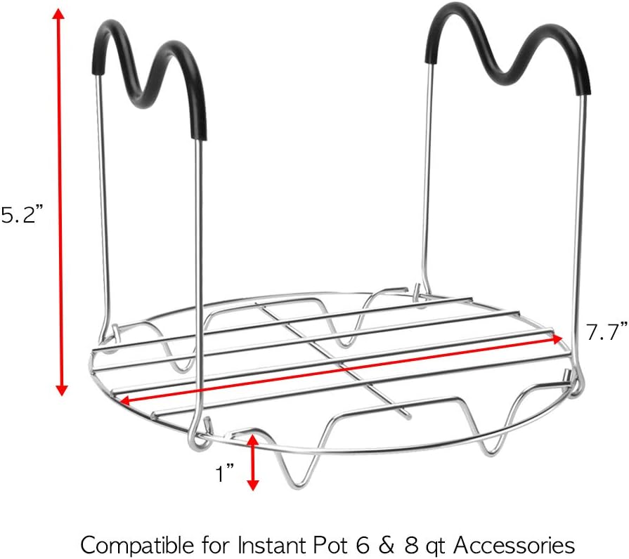 HEAT RESISTANT HANDLES - 5.2 inch heat resistant handles which makes it easier and safer to take food from your pot without burning yourself. GREAT DESIGN - 1 inch trivet compatible with instant pot above water when steaming, keep food out of the liquid, never worried about water overflow on top of the food. MULTI-PURPOSE - You can use it as a steamer rack trivet, wire rack, pressure cooker trivet, can also serve as a pan lifter or a cooling rack for the pressure cooker removable pot. PERFECT DIMMENSIONS - This trivet with handles works great with instant pot 6 qt or 8 quart, as well as other larger electric pressure cooker.