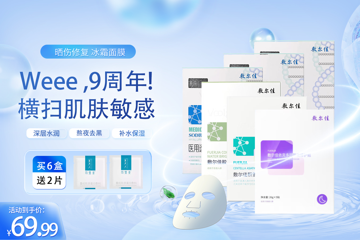 敷尔佳 白膜*3+绿膜*1+熬夜紫膜*1+积雪草*1 医美面膜顶流全体验【面膜礼包6盒套装】送2片可复美方型体验,共 6 箱
