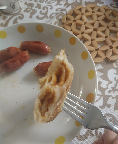 用平底锅煎三分钟放了一丢丢橄榄油,不用解冻,残手党也会操作,酱料出锅前涂在上面,咸甜口(原以为是辣酱),脆脆的口感不错。