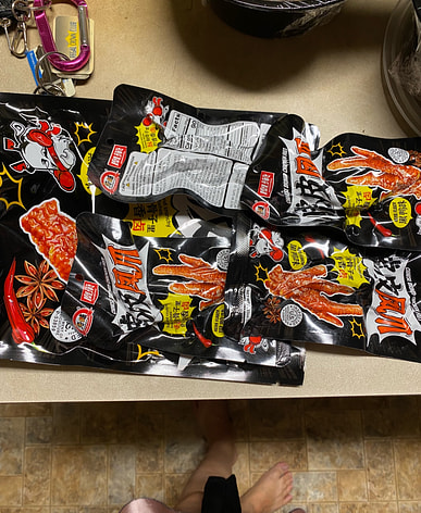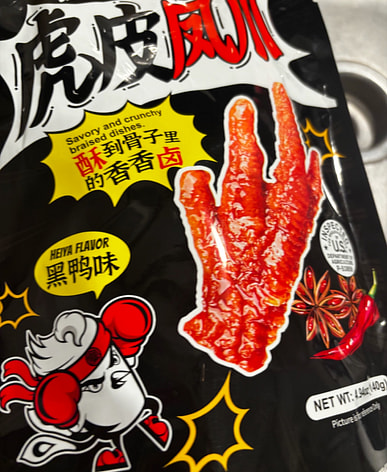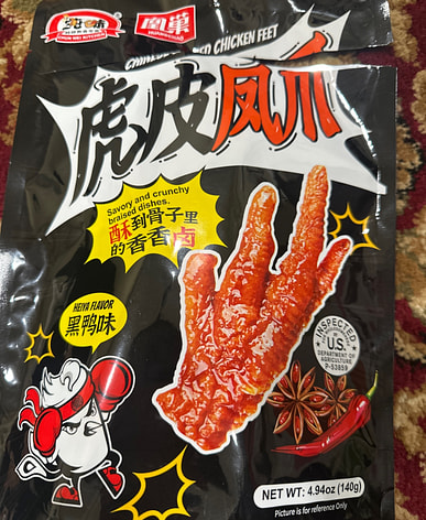我在中国吃过这个,没想到在美国能吃到。鸡爪绝对很辣。一包里面有 4 个独立包装的鸡爪。我肯定会再买一些!
