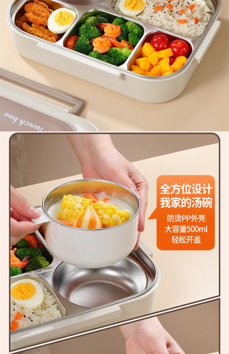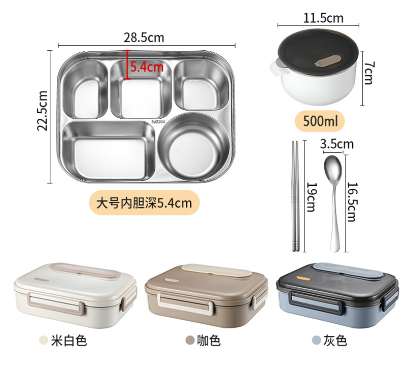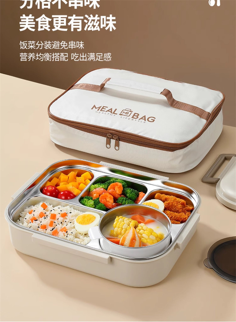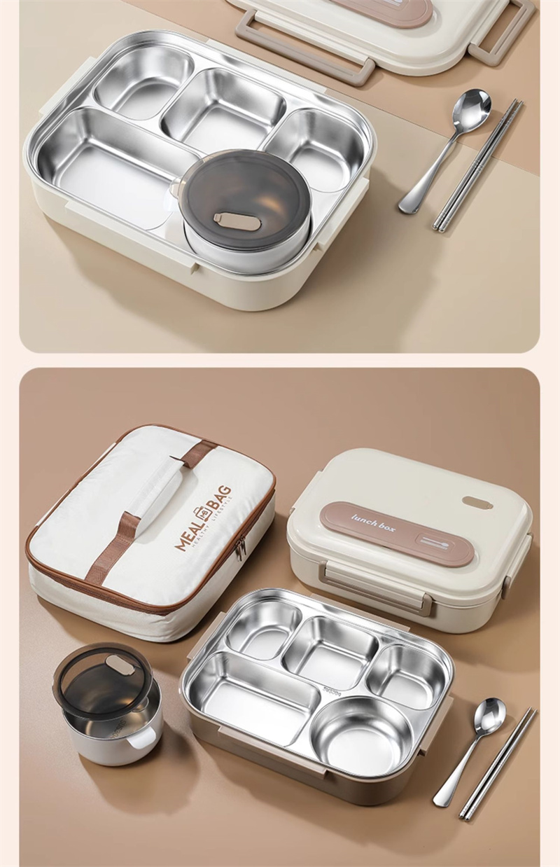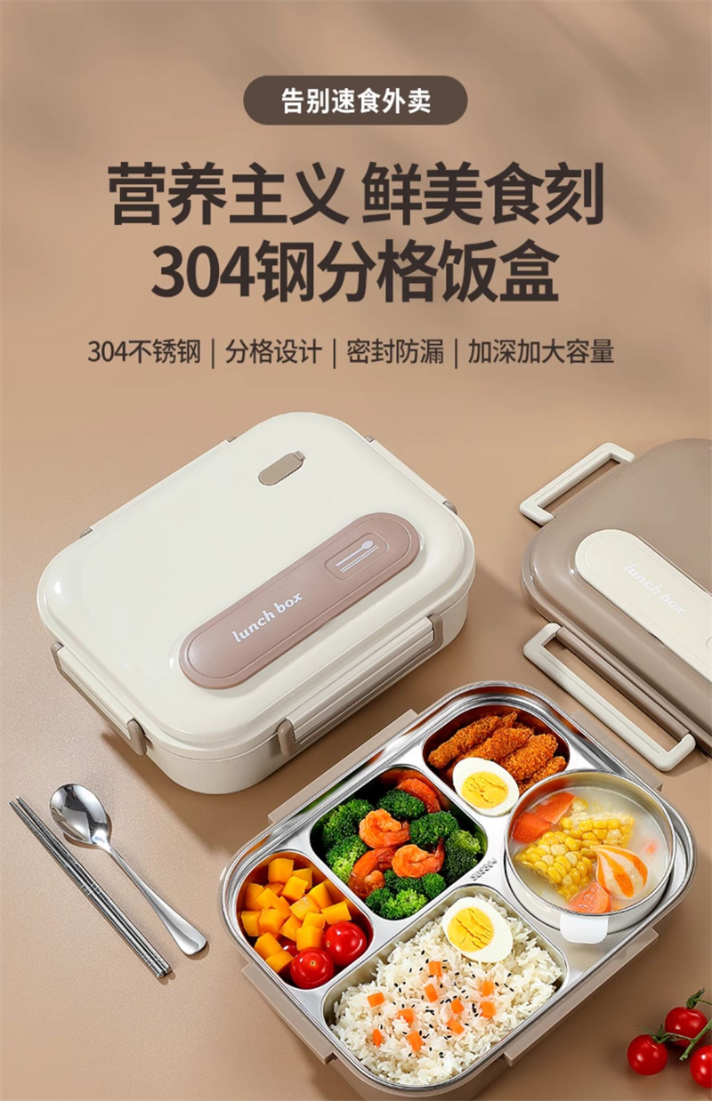 五格饭盒带汤碗上班族餐盒保温304不锈钢 大号米色 1 份