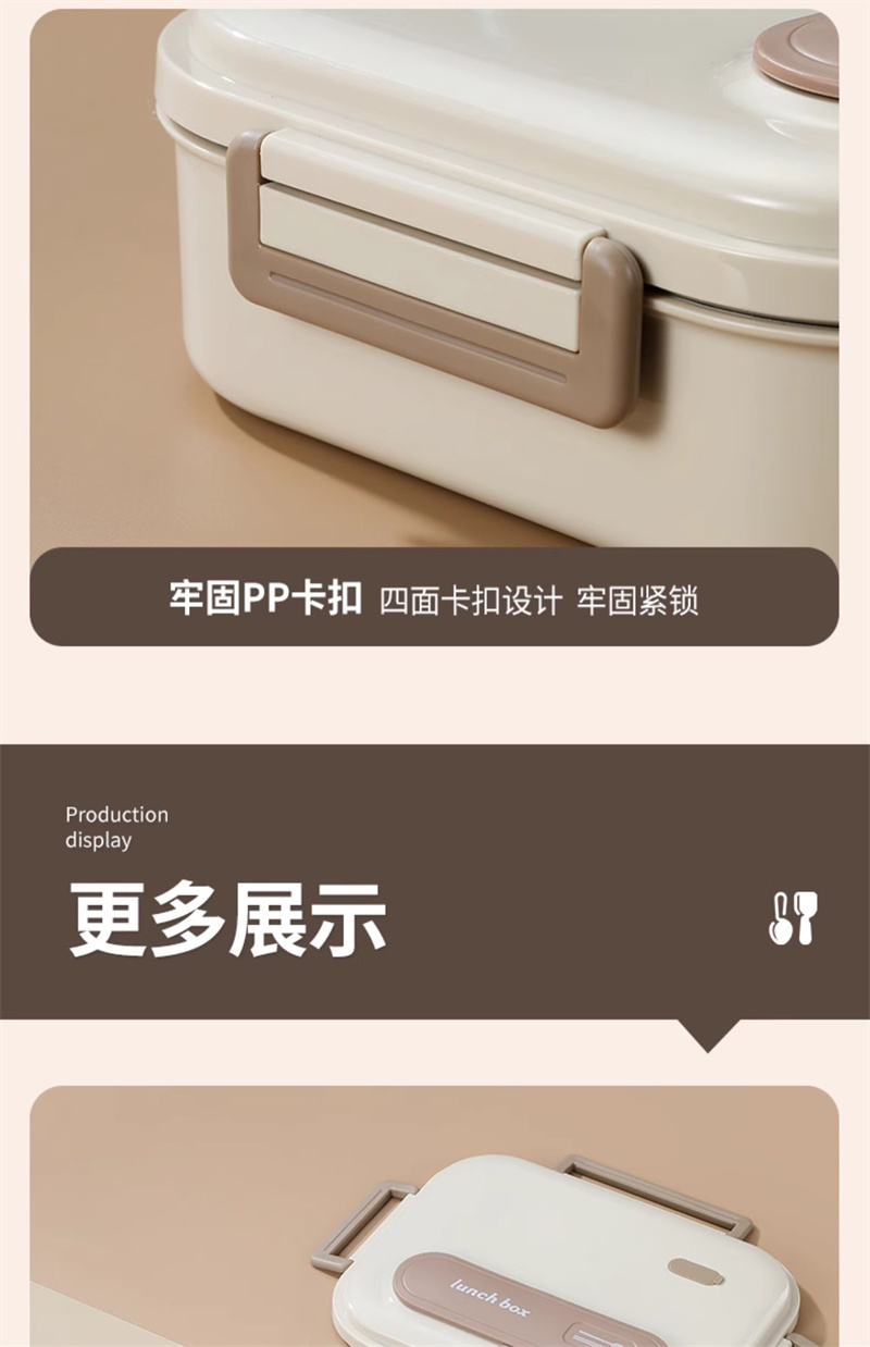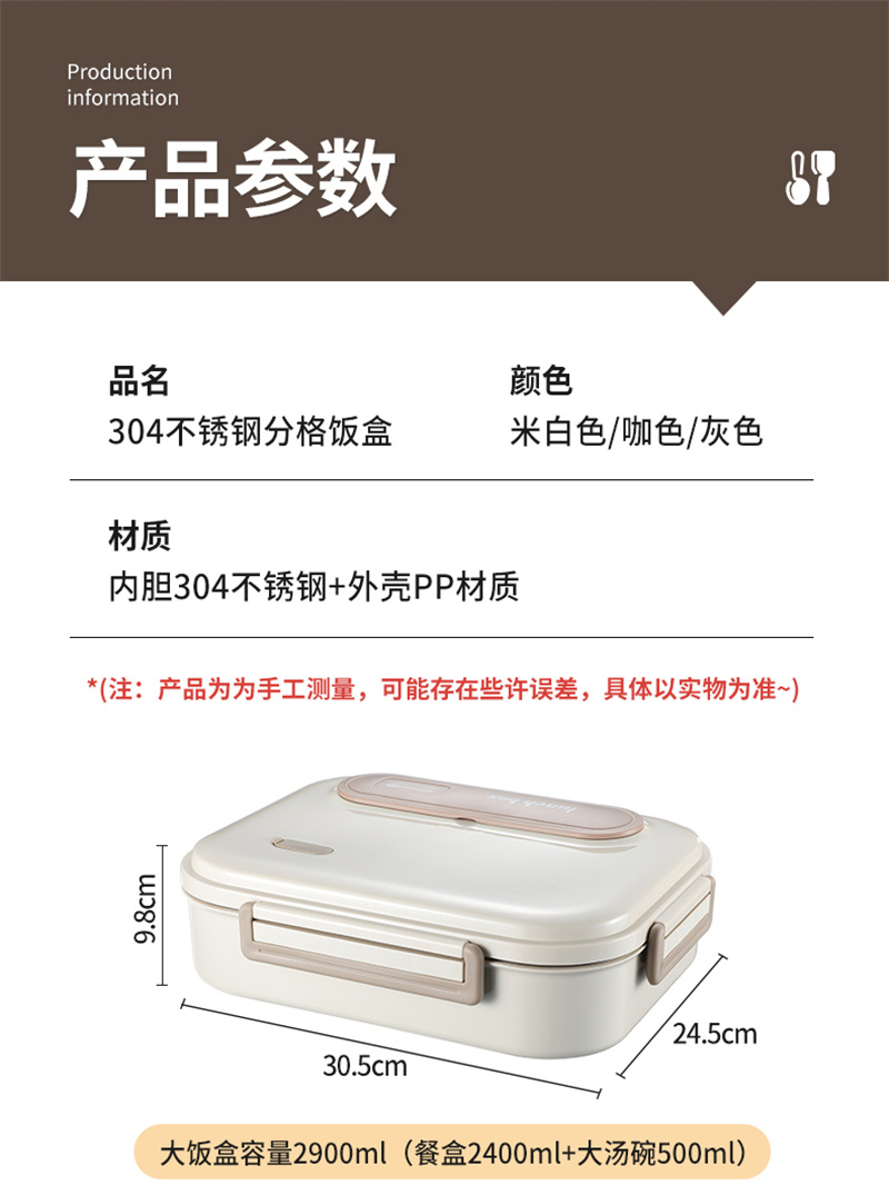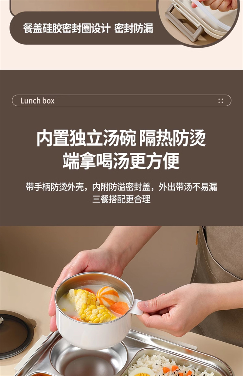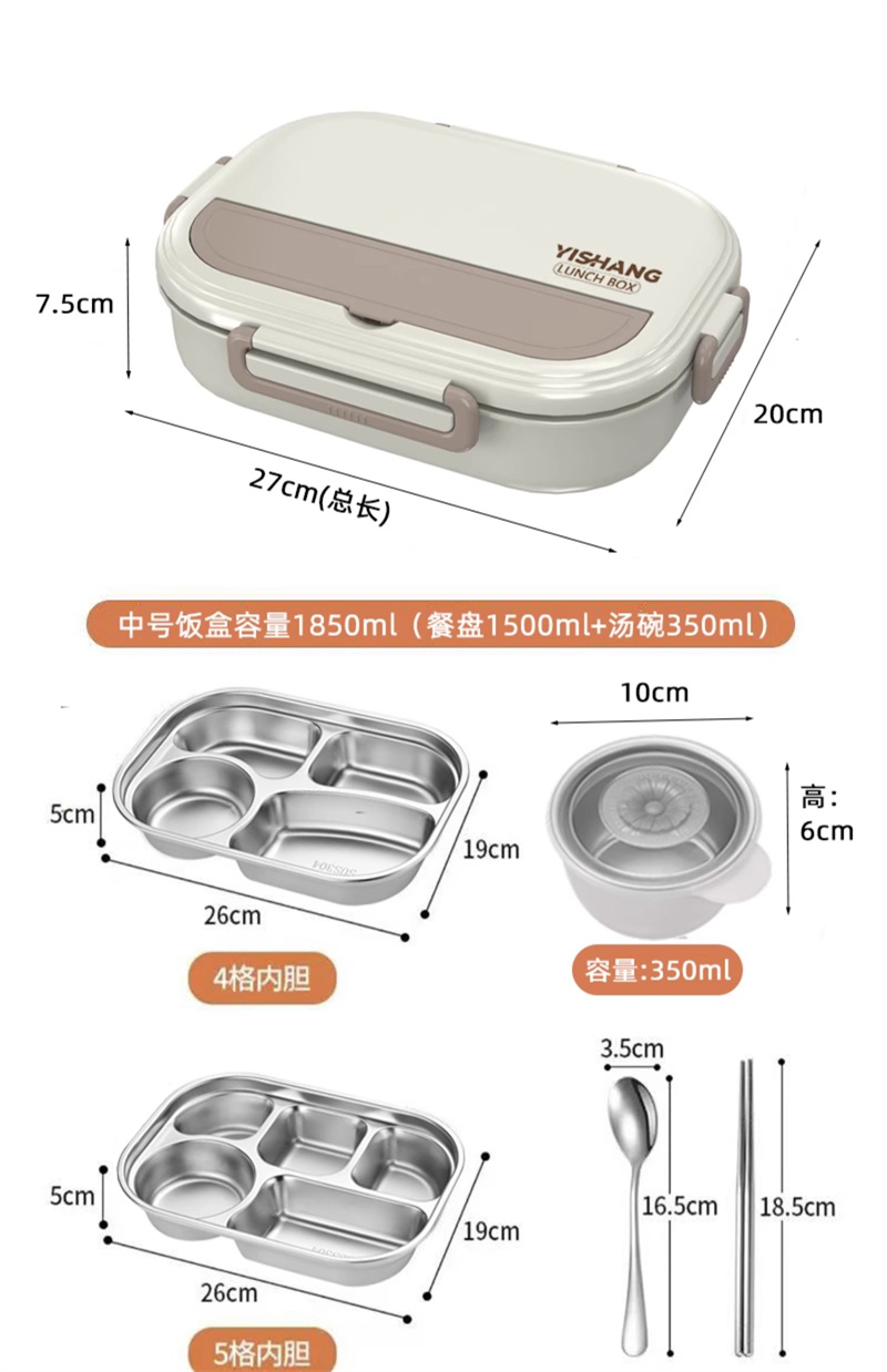 五格饭盒带汤碗上班族餐盒保温304不锈钢 大号米色 1 份