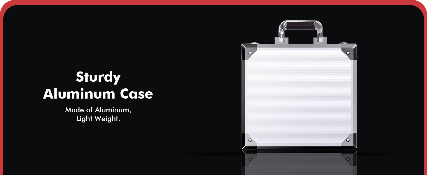 便携式铝制盒 – 我们的优质铝制盒让您轻松携带。加固的边角确保坚固耐用。此外,它还配备6个塑料托盘,可整齐地整理扑克筹码,同时防止其磨损和损坏。