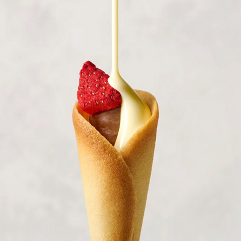 这款点心由松软口感的牛奶巧克力奶油包裹着白巧克力,再用香浓黄油味的酥脆薄饼(Langue de Chat)精心包裹而成。酸甜的草莓作为点缀,使这款花束形状的烘焙点心更加独特。