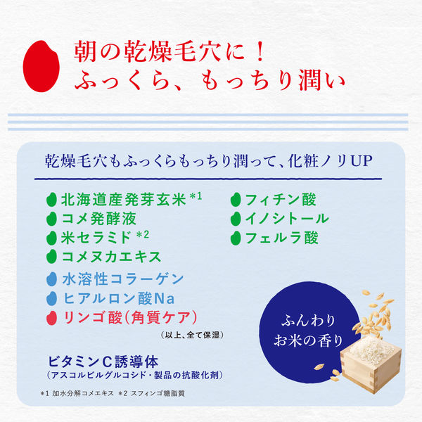 これ1枚で朝のお手入れは完了。貼るだけでふっくらと弾力のあるハリ肌に整え、お目ざめから60秒でメイクに進めます。発芽方法からこだわった北海道産の発芽玄米 をはじめ、日本人の肌質に合うお米由来の保湿成分を配合。しっとりすべすべ肌に。乾燥毛穴もふっくらもっちり潤って、化粧ノリの良い肌に。