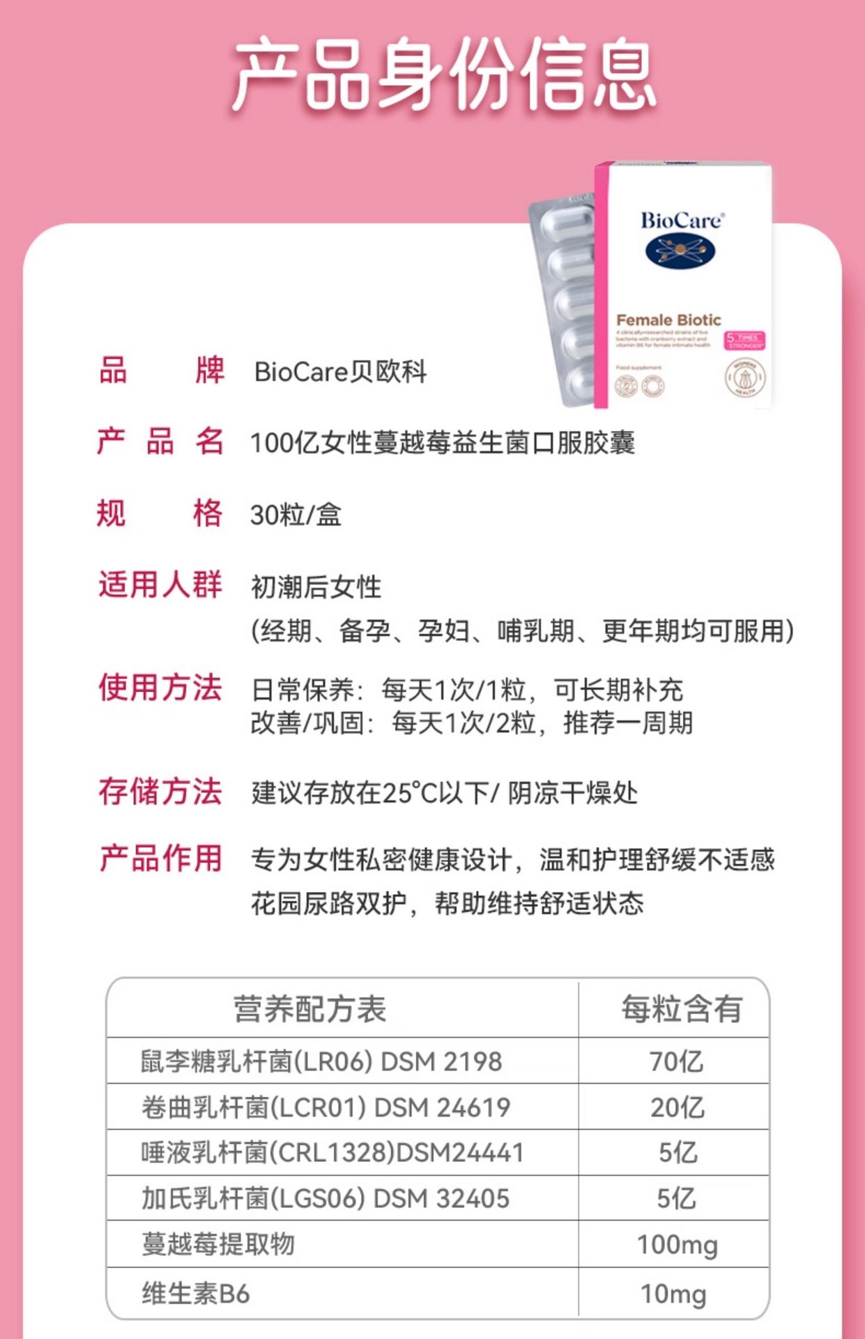 BioCare贝欧科私处蔓越莓女性益生菌 30粒 1 盒