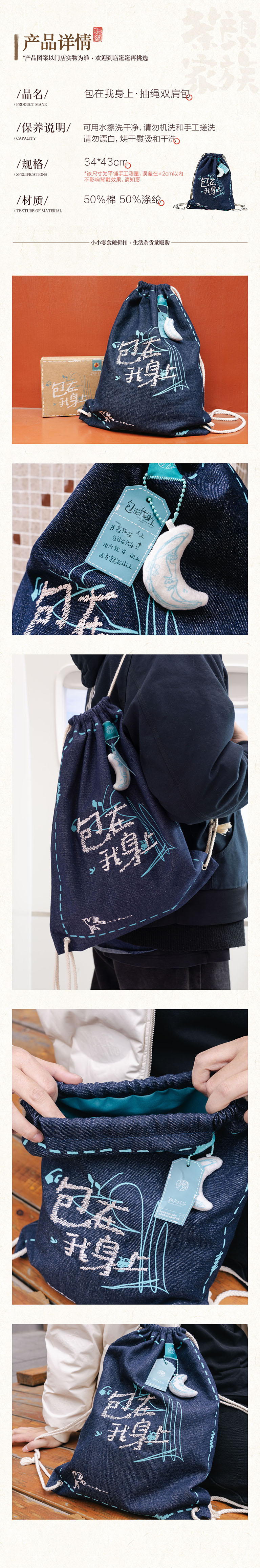 Classic denim-style drawstring backpack made from a 50% cotton + 50% polyester. Natural texture. Durable and easy to clean.