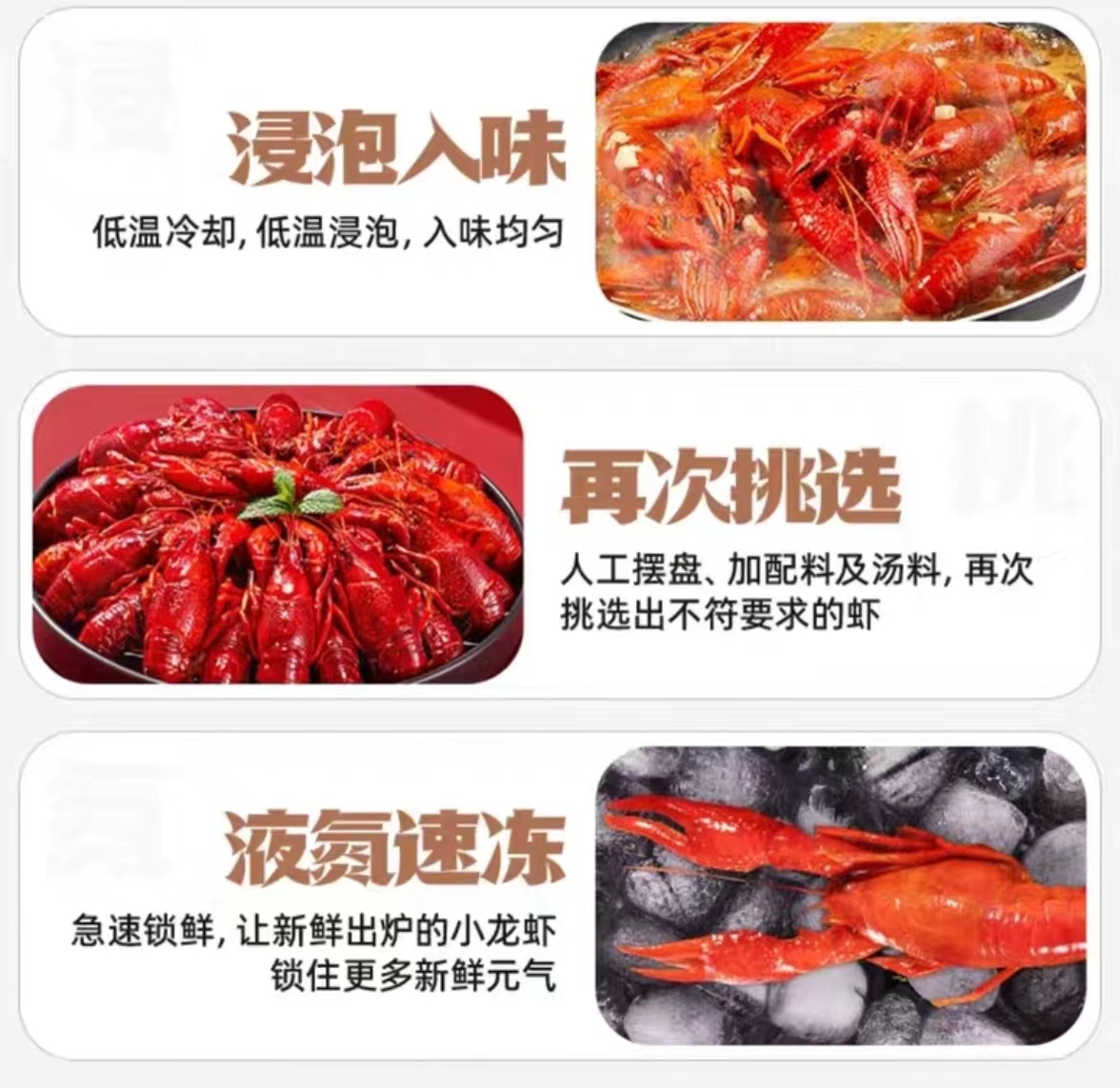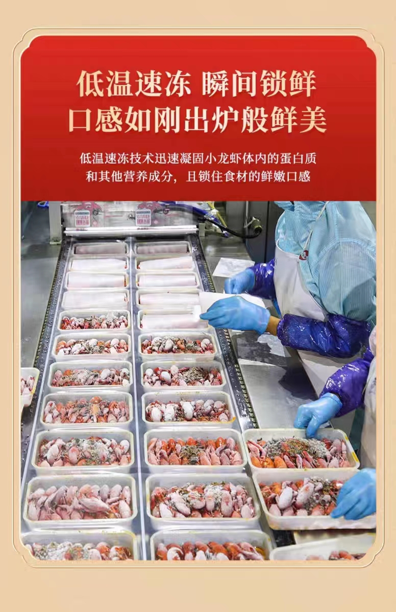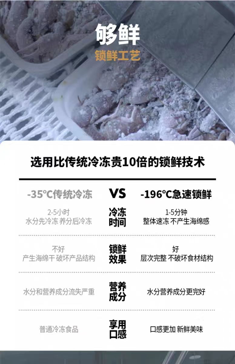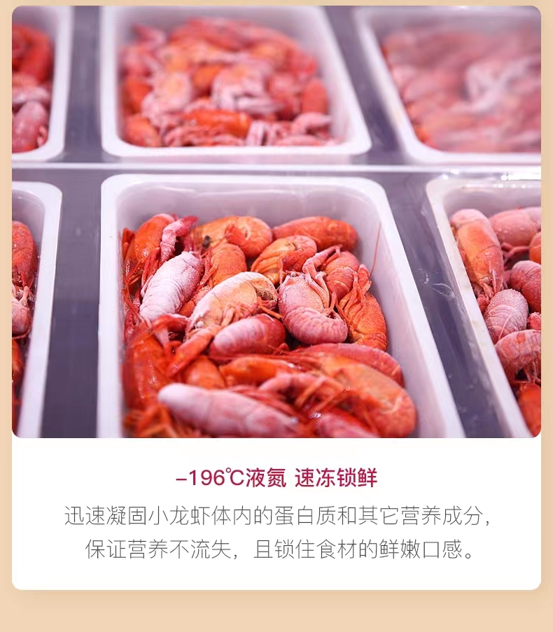 液氮速冻锁鲜技术的最大优势就是保存了食物的风味物质和营养成分,在锁住鲜活美味的同时,使微生物处于休眠状态,促使部分微生物低温死亡,有效保证了食品安全;用液氮速冻锁鲜技术处理后的小龙虾与刚烹煮出来的小龙虾基本相同,口感良好,口味鲜美,还原度能达到95%以上。