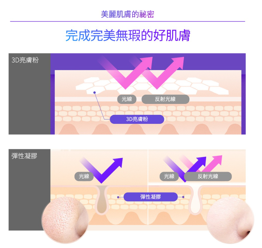 特製的3D亮膚粉微顆粒將肌膚的光線向多方面反色, 讓您的肌膚無論在哪個角度都能夠光彩耀眼。