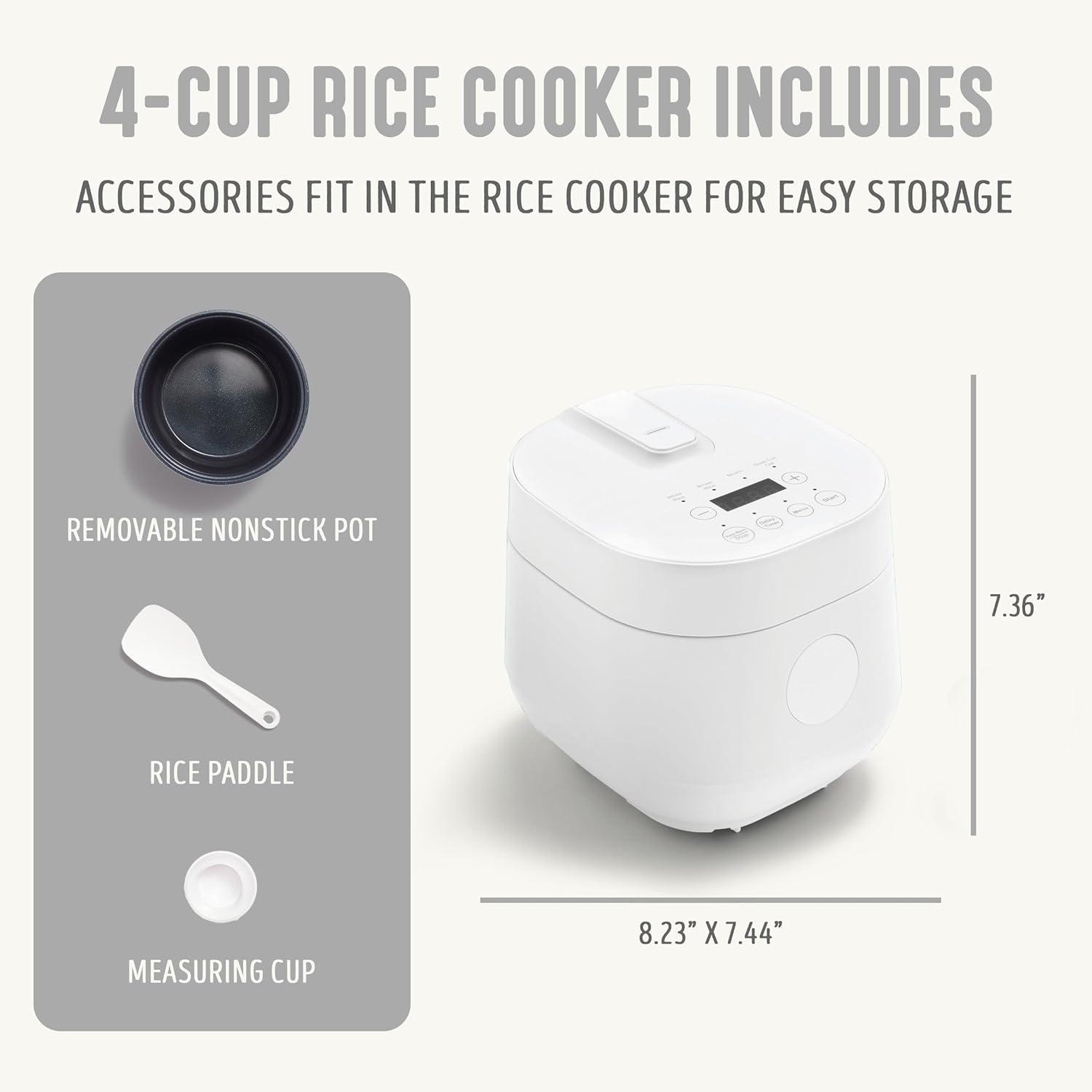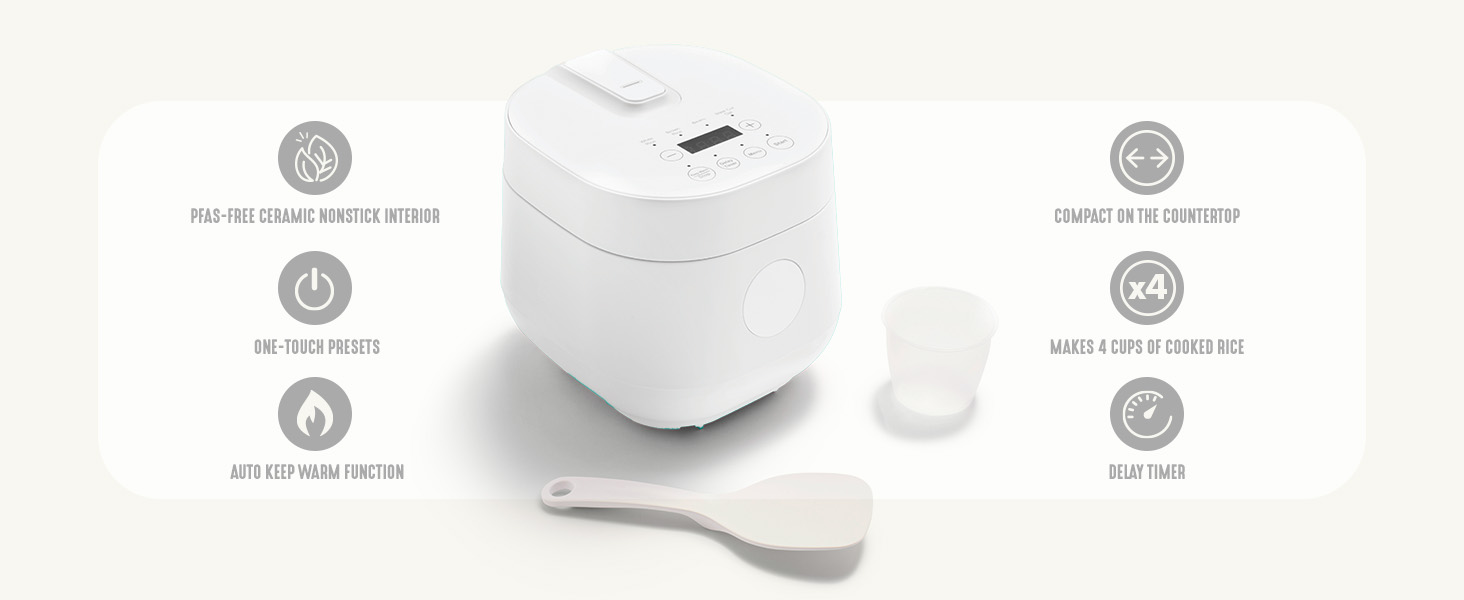 数码电饭煲,2 杯生米/4 杯熟米,可拆卸不粘陶瓷内胆,不含 PFAS,一键预设,燕麦,藜麦、糙米、自动保温、模糊逻辑技术、1.5夸脱、白色