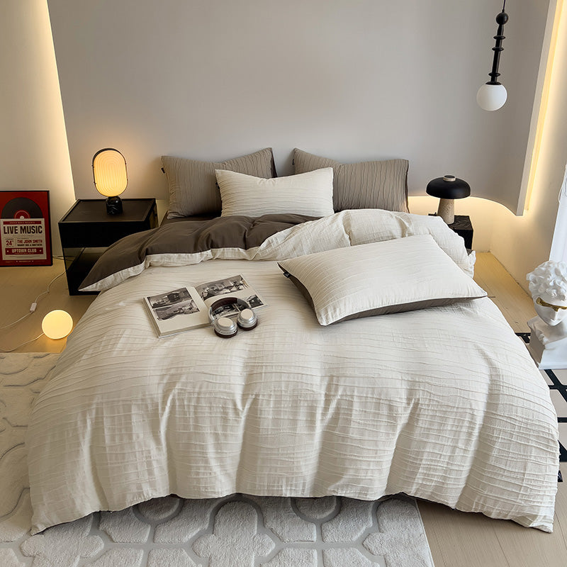 采用独特绉绉纱工艺,赋予面料天然生动的凹凸肌理感与卓越透气性。触感软糯亲肤,带着复古的舒适与安心。低饱和色调,渲染出宁静慵懒的卧室氛围,为您打造一个充满故事感的睡眠空间。