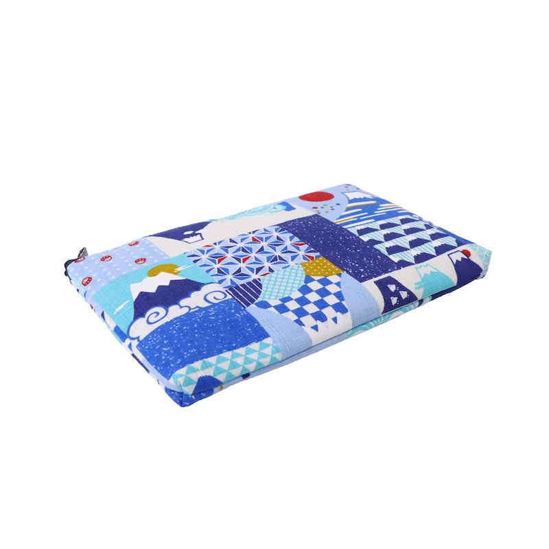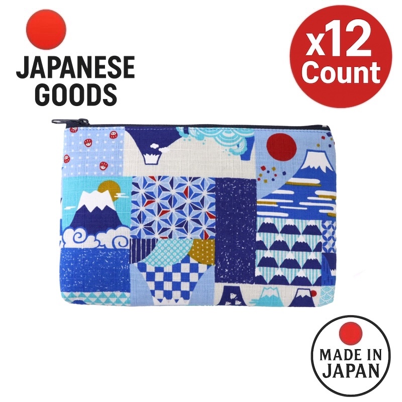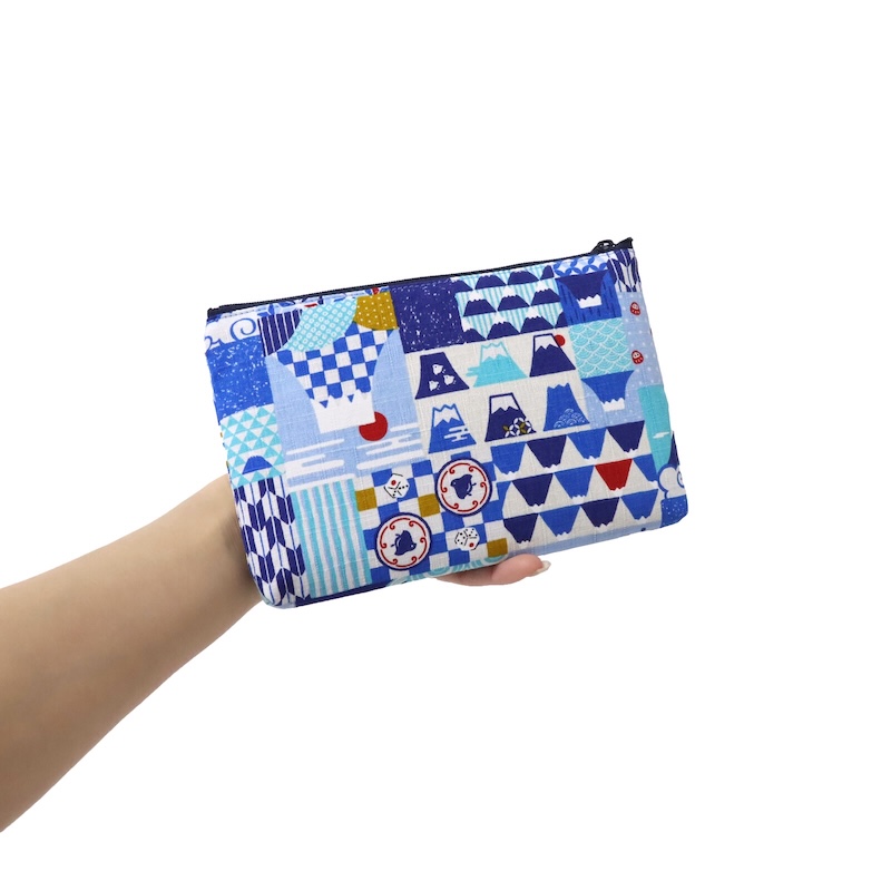 这款方形小袋采用富士山插图和轮廓,并饰有格子图案和矢羽(箭羽)等日本传统图案。