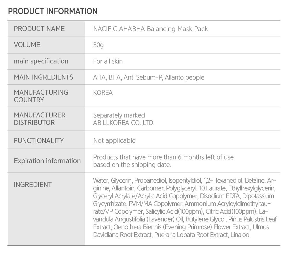NACIFIC AHA BHA Balancing Mask Pack 10 个