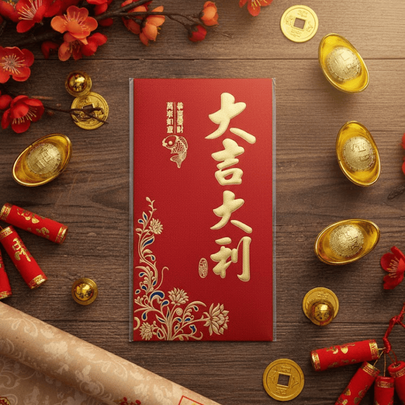 ,以金色“大吉大利”字样和鲤鱼图案为特色,象征着财富、发展和好运。