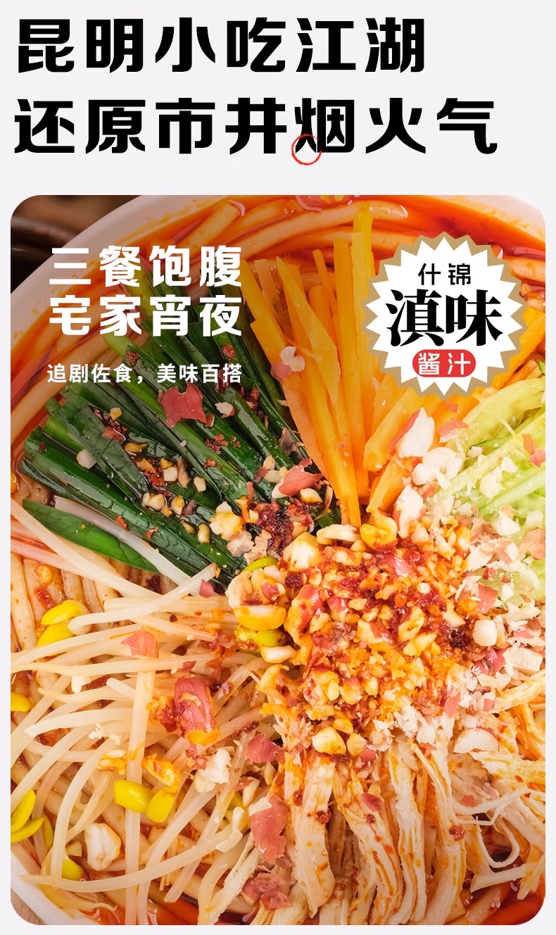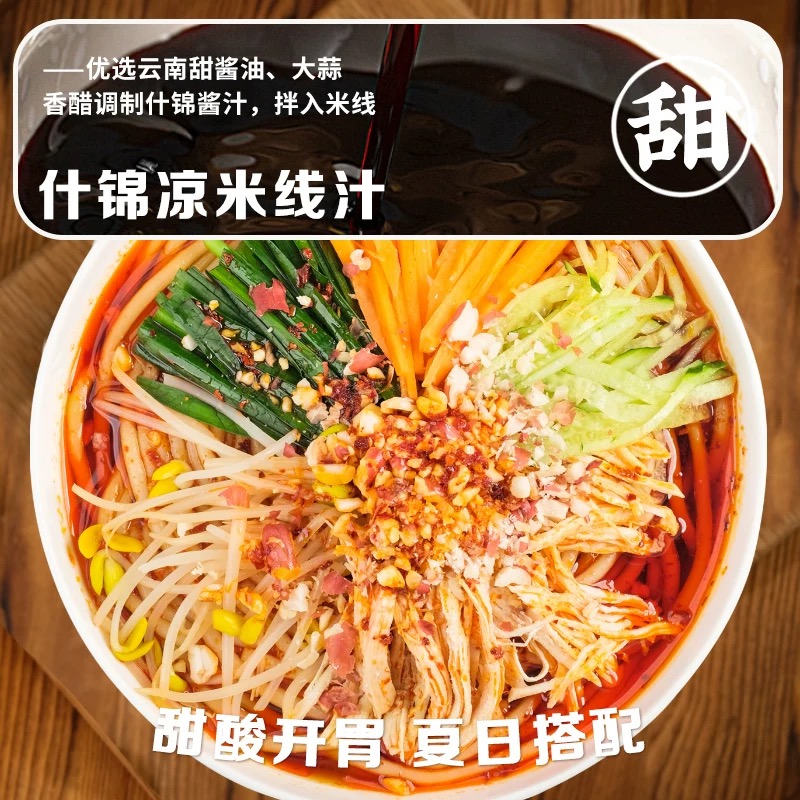 选用蒙自酸浆米线,经发酵工艺制成,质地爽滑有韧性,冷水浸泡后更显冰凉劲道,适合夏季食用。