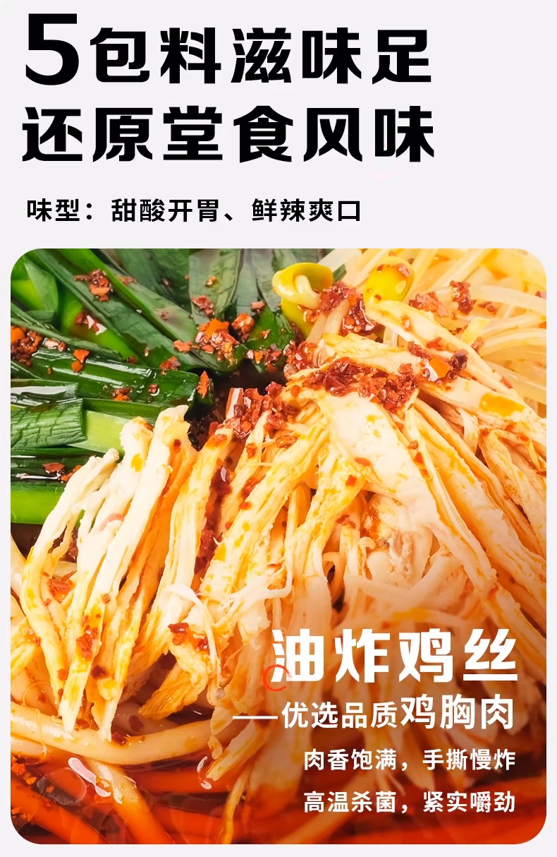 黄瓜丝、胡萝卜丝、豆芽等爽脆蔬菜打底,淋上酱汁后撒鸡丝,最后点缀油炸豌豆或脆哨,色彩上红绿黄白相间,视觉清爽。