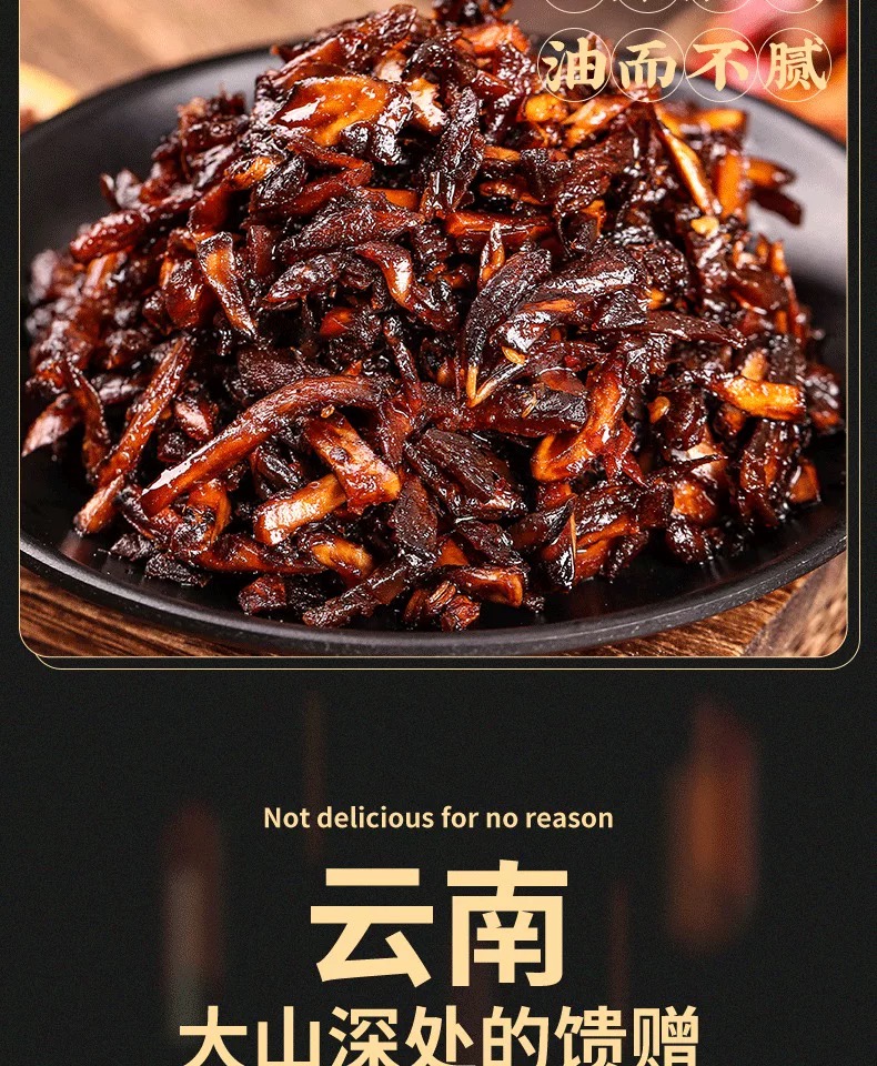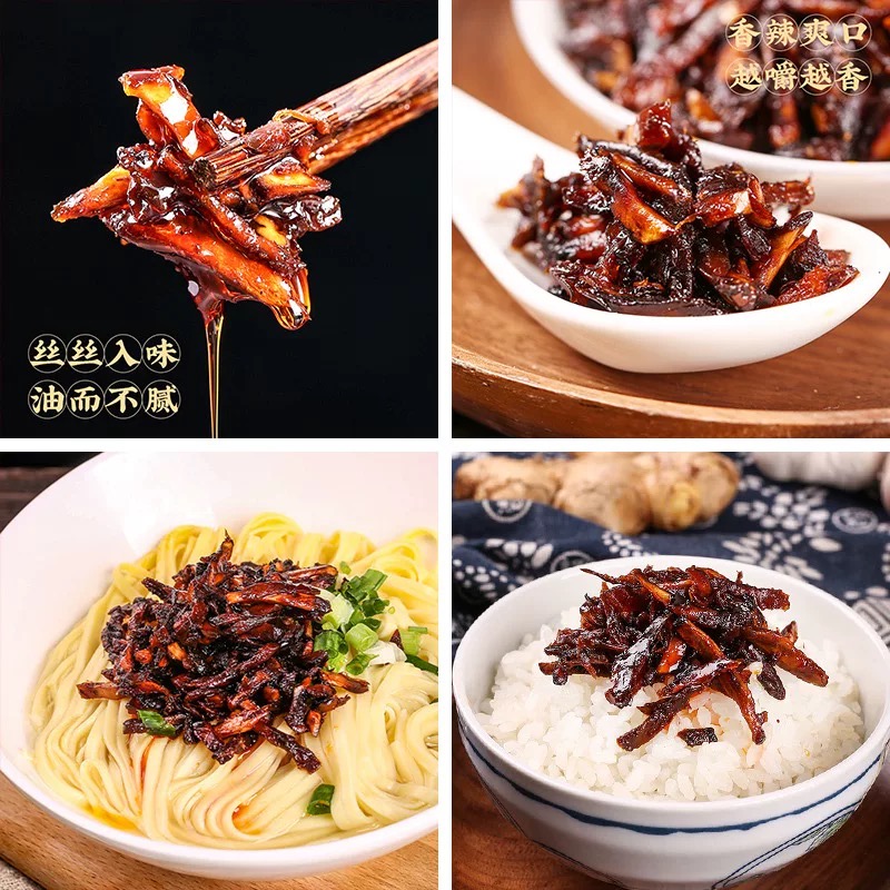• 工艺:经清洗、切丝后,以文火慢炸逼出水分,再用植物油浸润封存其鲜香。
