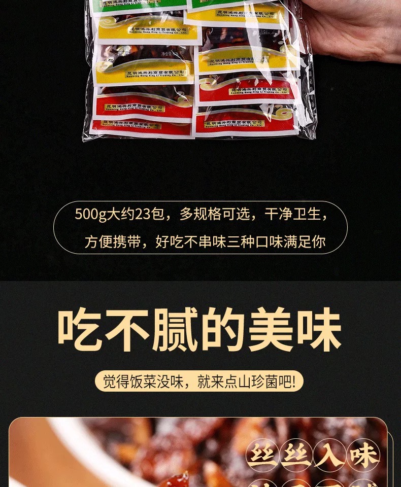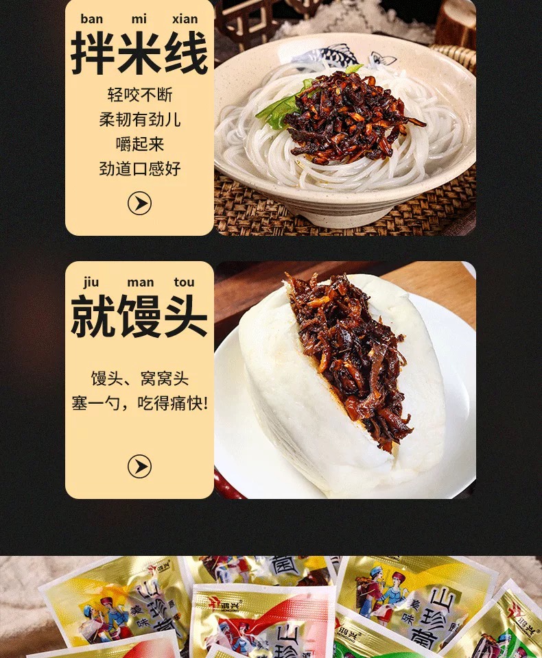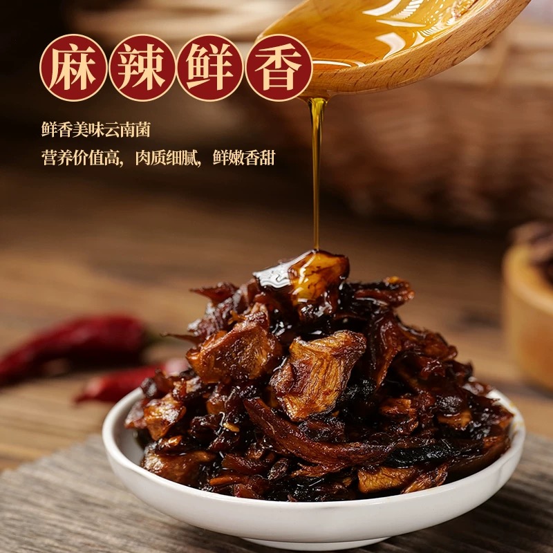 • 原料:通常将鸡枞菌、牛肝菌、香菇等多种菌菇混合在一起,再加入辣椒、蒜片、花椒等调料。