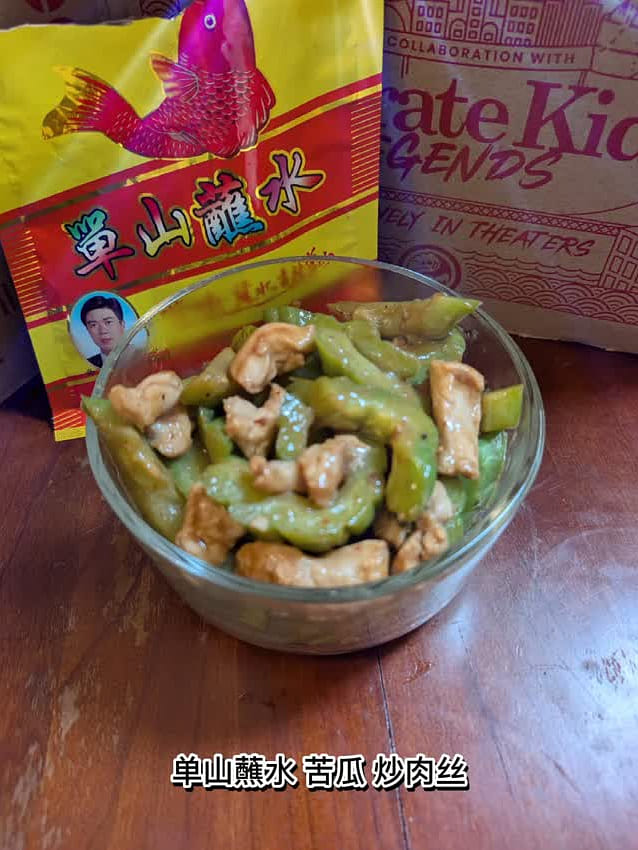 Thịt heo xé xào mướp đắng chấm nước chấm Đan Sơn
