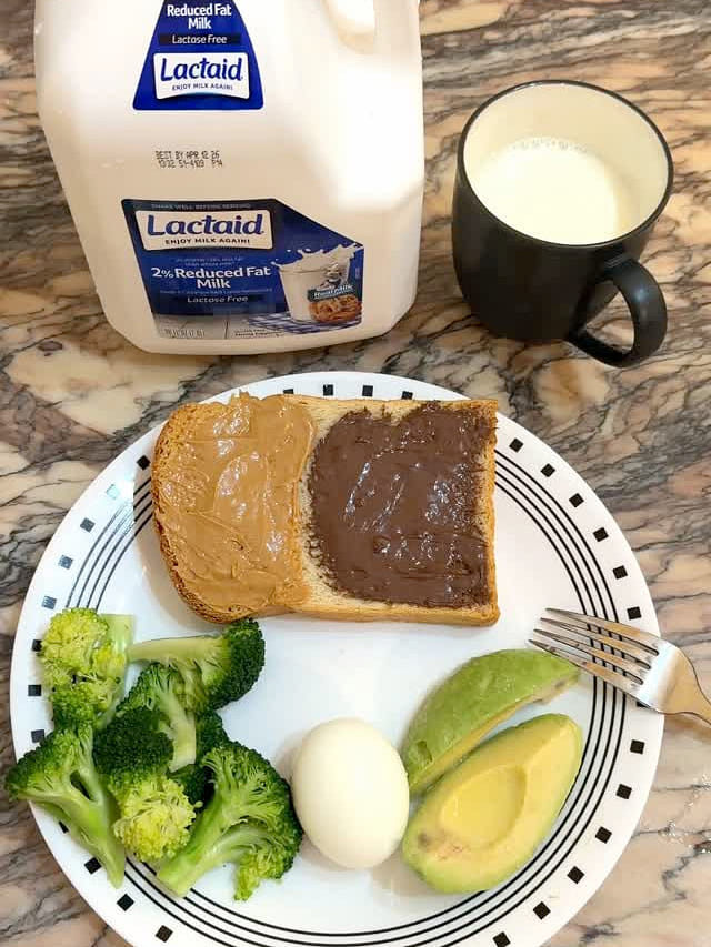 早餐 - 奶 、巧克力花生酱吐司、牛油果、蛋、西兰花