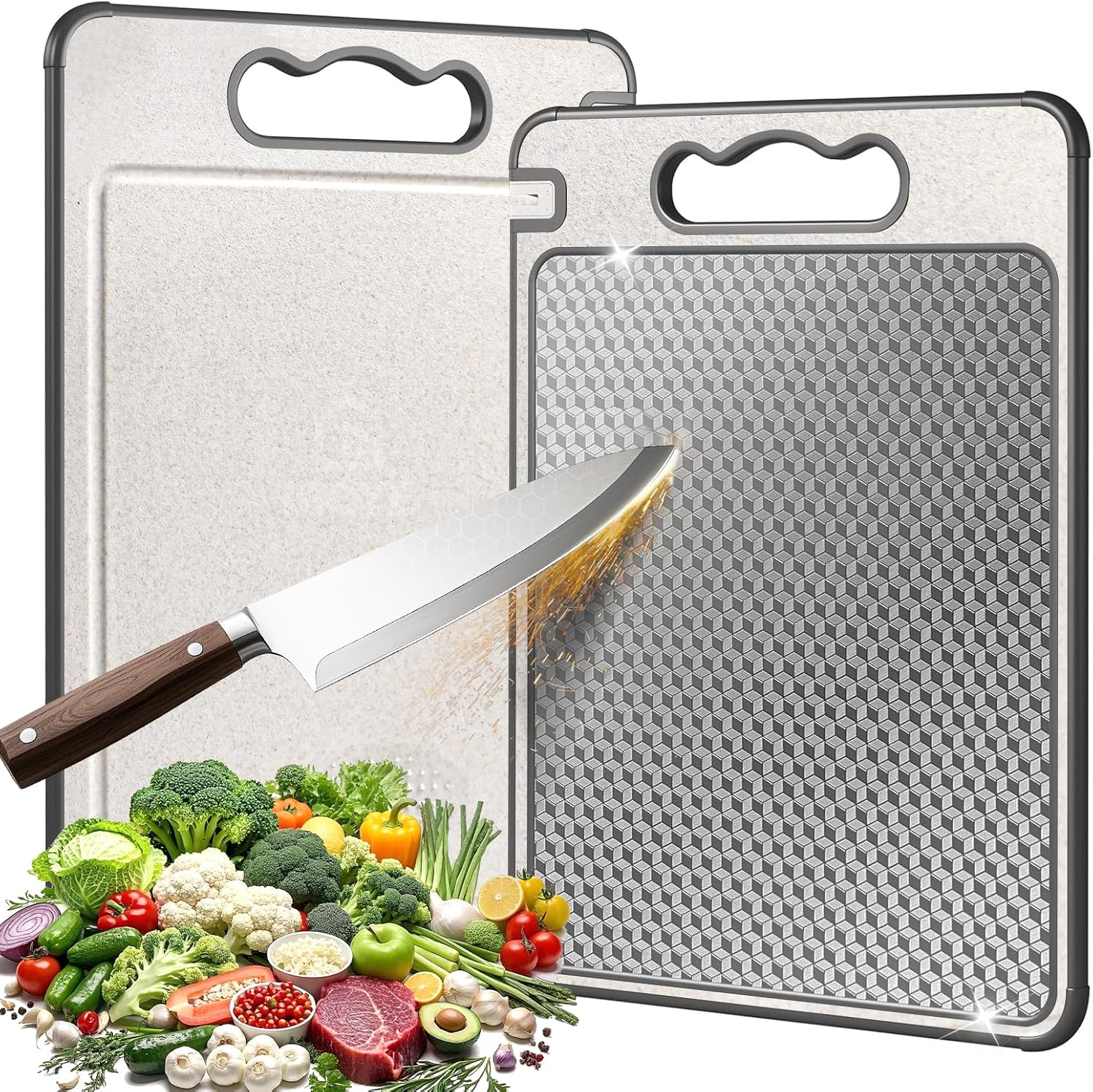 - 【二合一砧板】砧板是一款多功能的二合一廚房工具,一面採用食品級304不鏽鋼製成,用於切割生熟肉類,另一面採用小麥秸稈PP材質(不含BPA)製成,用於切蔬菜和水果,避免交叉,健康無異味。