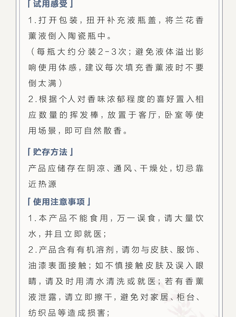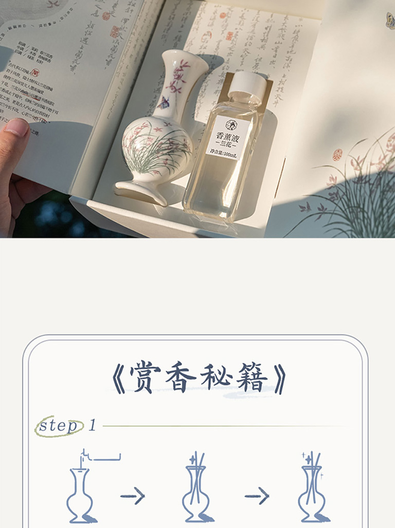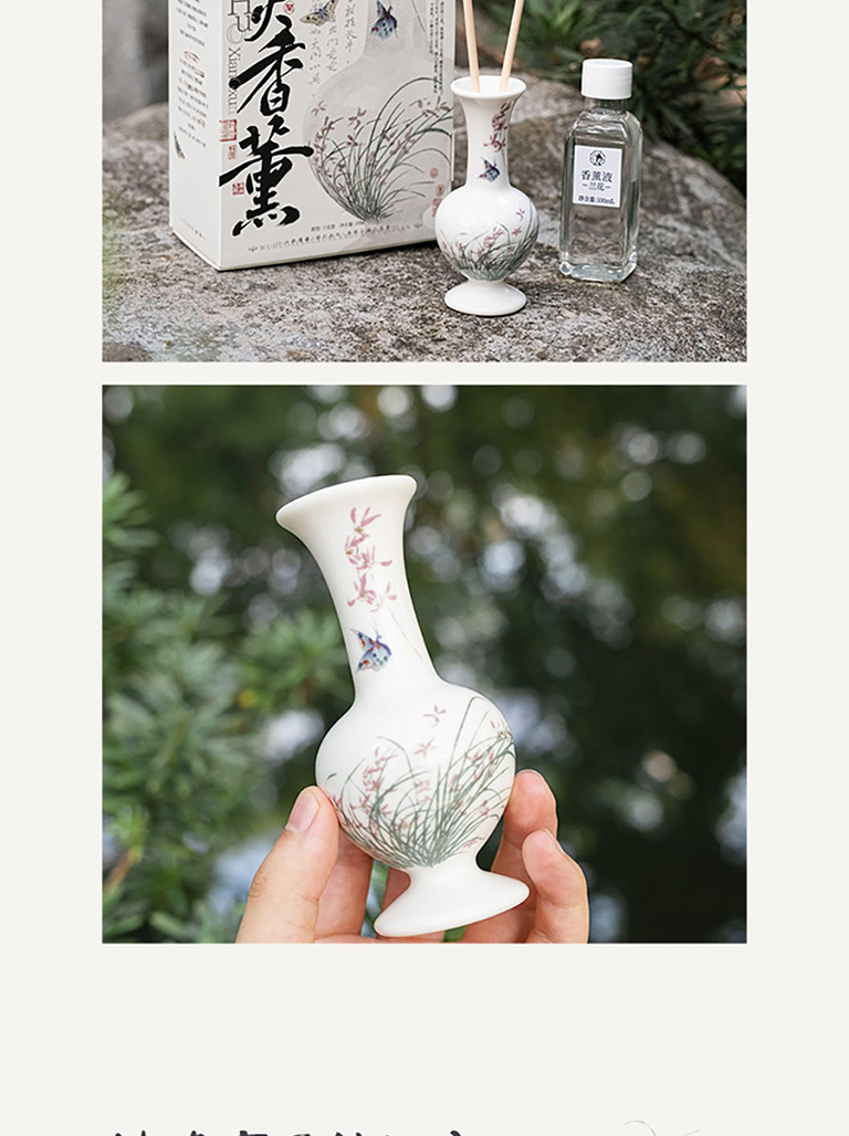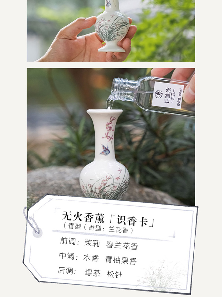 1、來自瑞士奇華頓的定製蘭花香型無火藤條香薰;2、產品組成:1盒產品中包含1箇中式陶瓷瓶、香精揮發棒6根、香薰液100毫升;3、使用場景:適用於居家客廳、書房、以及辦公室等場所。泡澡時也可以放置在旁邊,聞着幽幽淡香,彷彿置身大自然,身心放鬆;4、產品材質:可重複使用陶瓷瓶,插根枯枝都是藝術裝飾,用於居家裝飾擺件。5、東方美學伴手禮:不錯的伴手禮選擇,優雅神祕。生命就該浪費在美好的氣味裏,無需點火插電,讓五星酒店的鬆弛感在臥室流淌,可通過調整藤條數量,定製香味強度,創造理想家居香氛體驗;