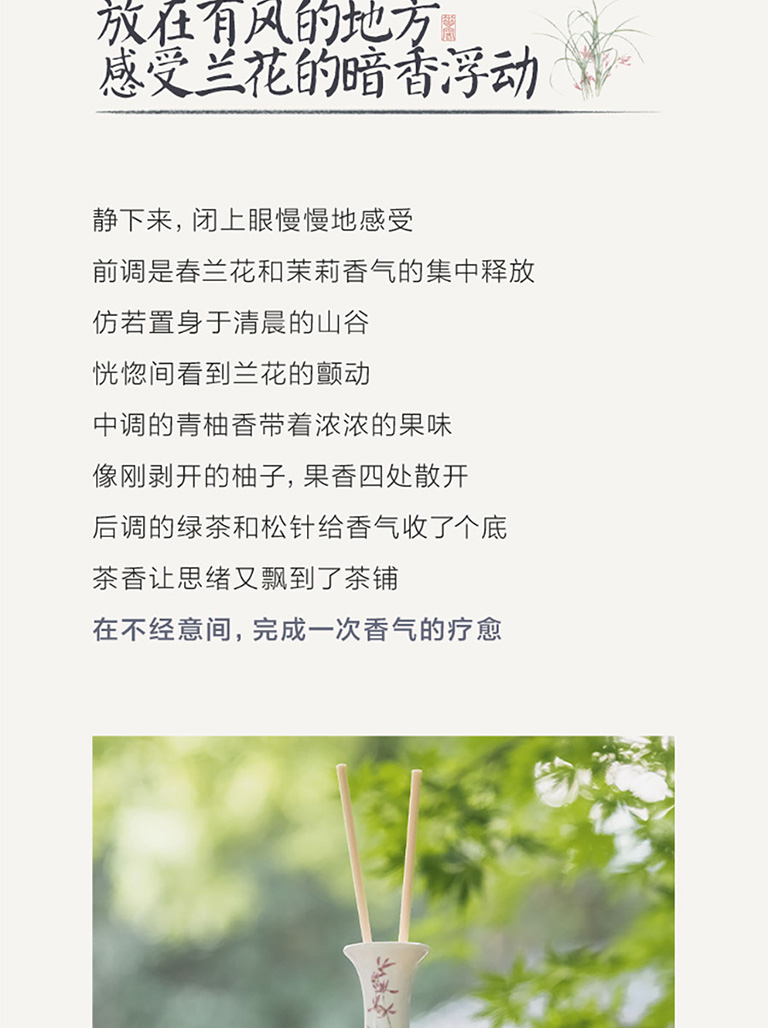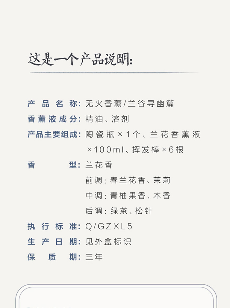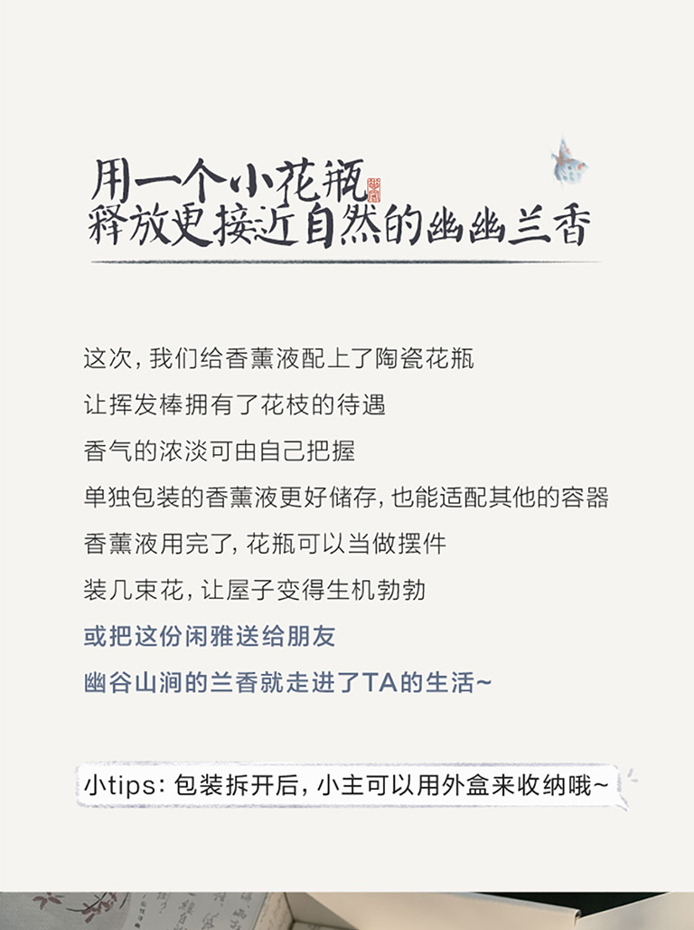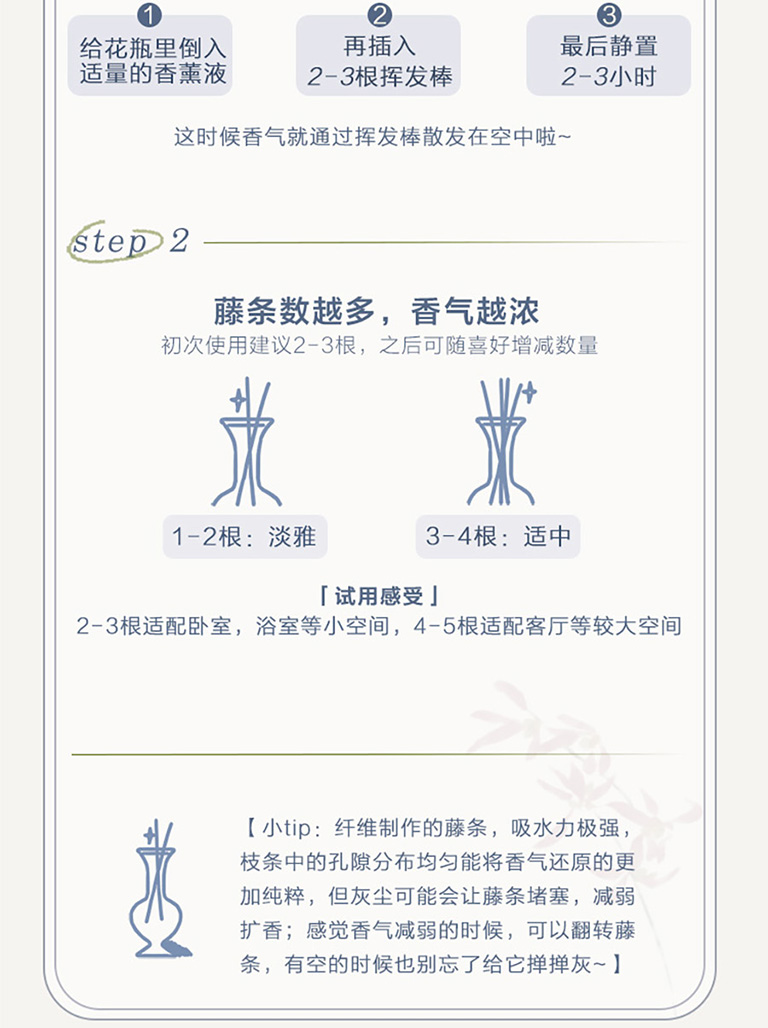 1、來自瑞士奇華頓的定製蘭花香型無火藤條香薰;2、產品組成:1盒產品中包含1箇中式陶瓷瓶、香精揮發棒6根、香薰液100毫升;3、使用場景:適用於居家客廳、書房、以及辦公室等場所。泡澡時也可以放置在旁邊,聞着幽幽淡香,彷彿置身大自然,身心放鬆;4、產品材質:可重複使用陶瓷瓶,插根枯枝都是藝術裝飾,用於居家裝飾擺件。5、東方美學伴手禮:不錯的伴手禮選擇,優雅神祕。生命就該浪費在美好的氣味裏,無需點火插電,讓五星酒店的鬆弛感在臥室流淌,可通過調整藤條數量,定製香味強度,創造理想家居香氛體驗;