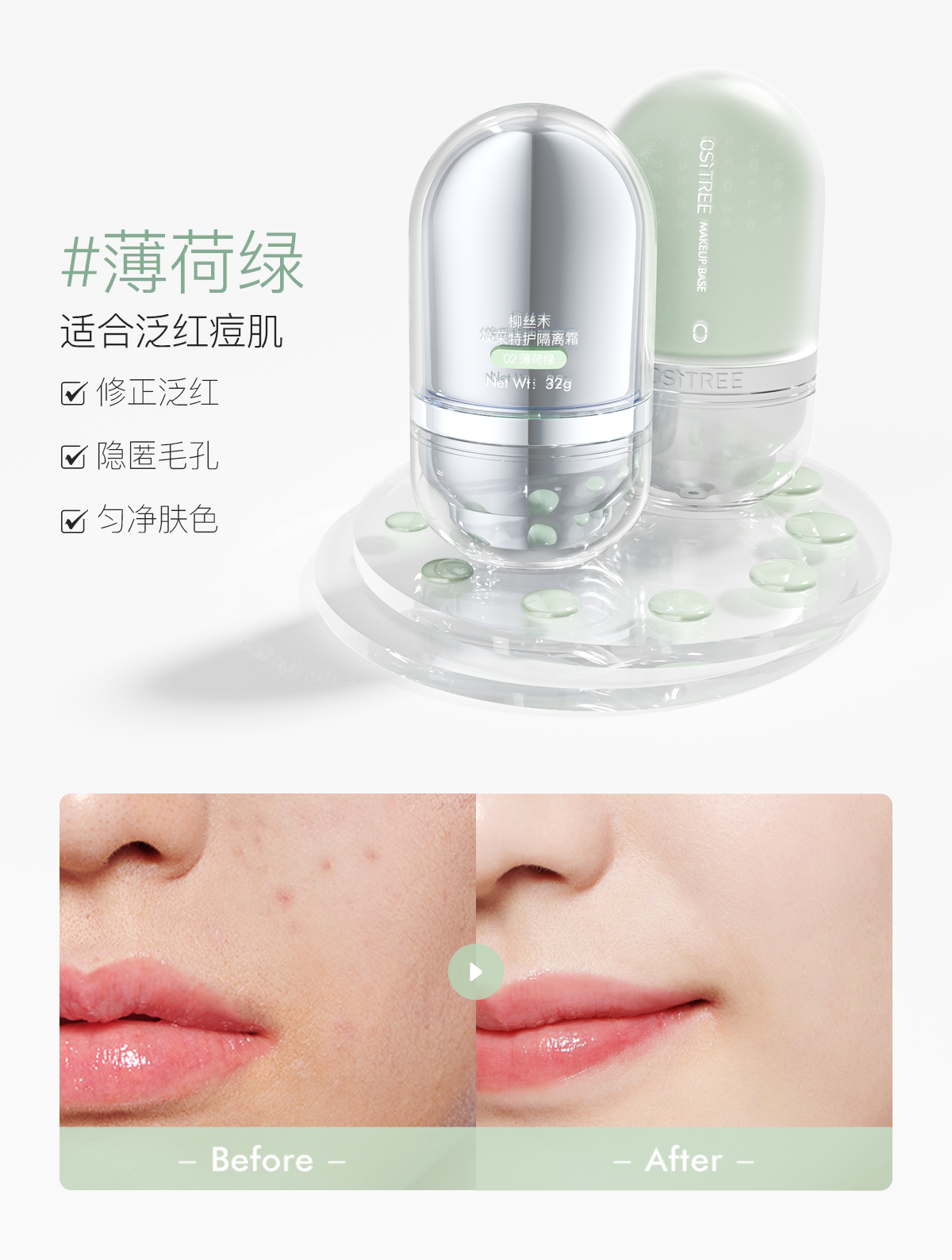 柳丝木 变色隔离霜 适合泛红痘肌 薄荷绿1瓶 32 克