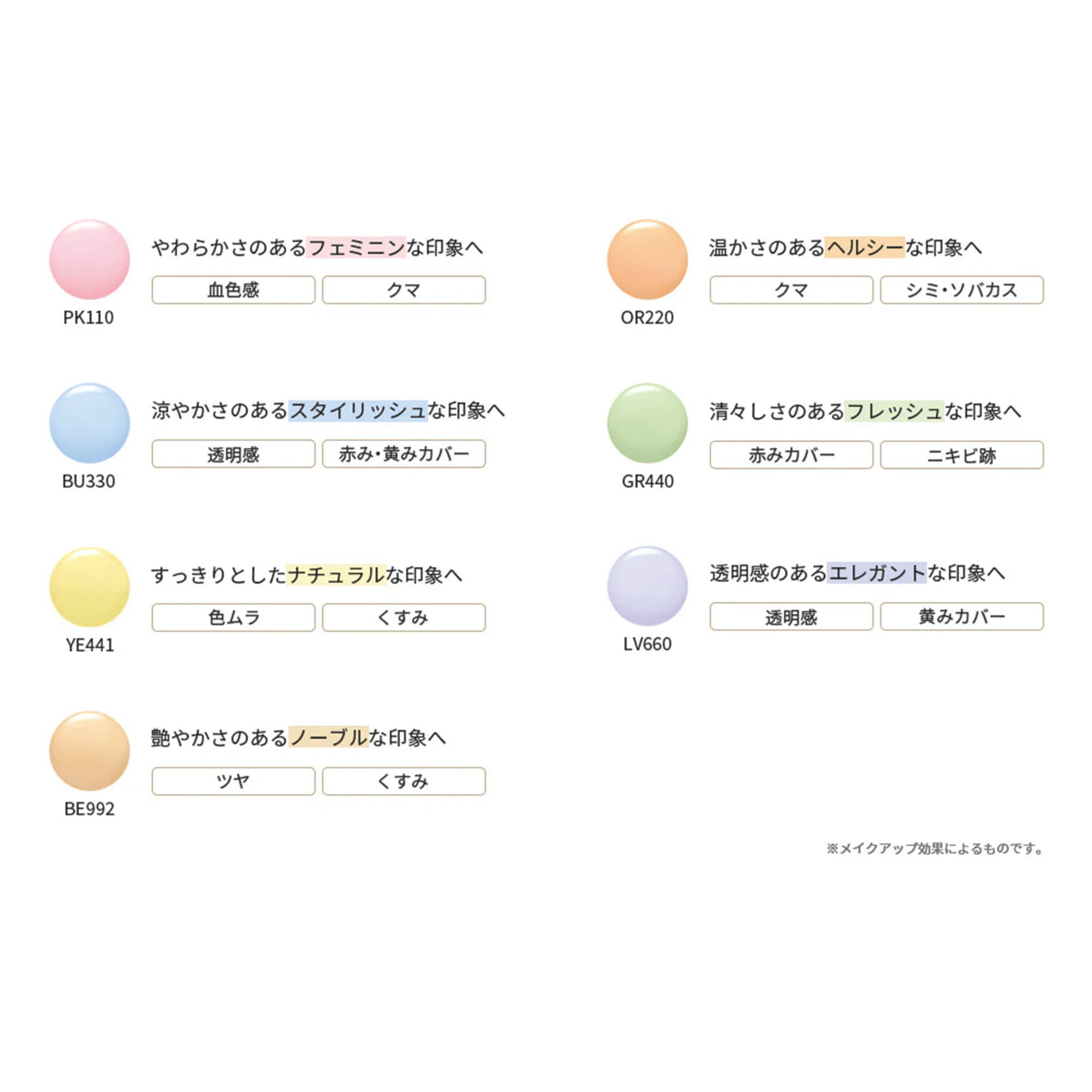 A color-correcting makeup base that smooths and refines the skin while protecting against UV rays. It helps blur uneven texture and discoloration, delivering a desired complexion through high color-control performance. With sebum-proof properties, it keeps the makeup looking fresh and beautiful for longer.