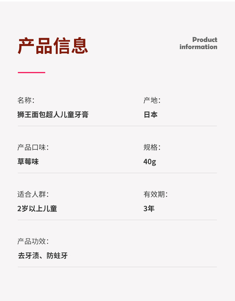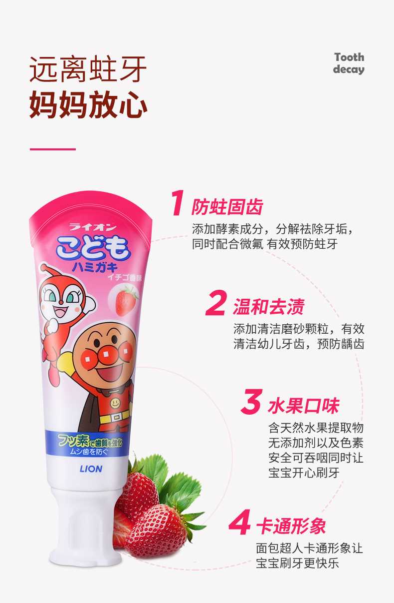 The name of this toothpaste is LION Lion King Anpanman Baby Tooth Protection Xylitol Toothpaste, which weighs 40 grams and is suitable for babies aged 0-6. The main ingredient of toothpaste is xylitol, which can effectively inhibit the growth of oral bacteria and prevent tooth decay. In addition, strawberry flavor is added to the toothpaste to make it more pleasant for babies to use. This toothpaste can be swallowed, so there is no need to worry about adverse reactions after the baby swallows it by mistake. It is recommended to use it in the morning and evening every day, and the dosage should not be too much, so as not to affect the oral health of the baby.