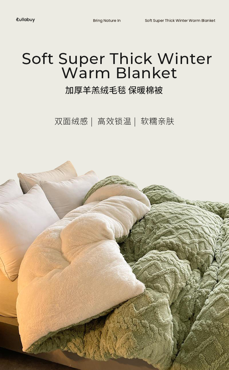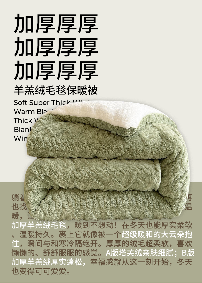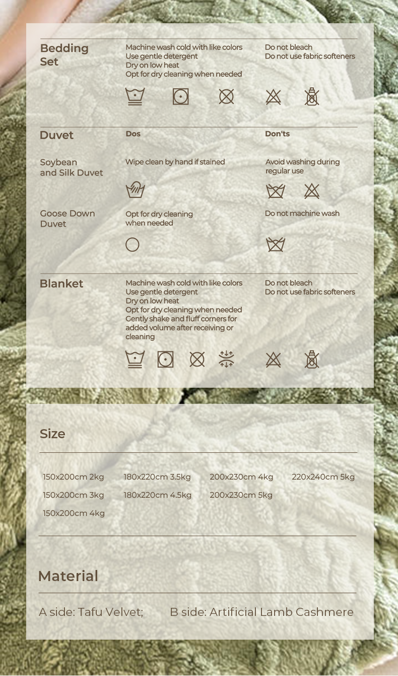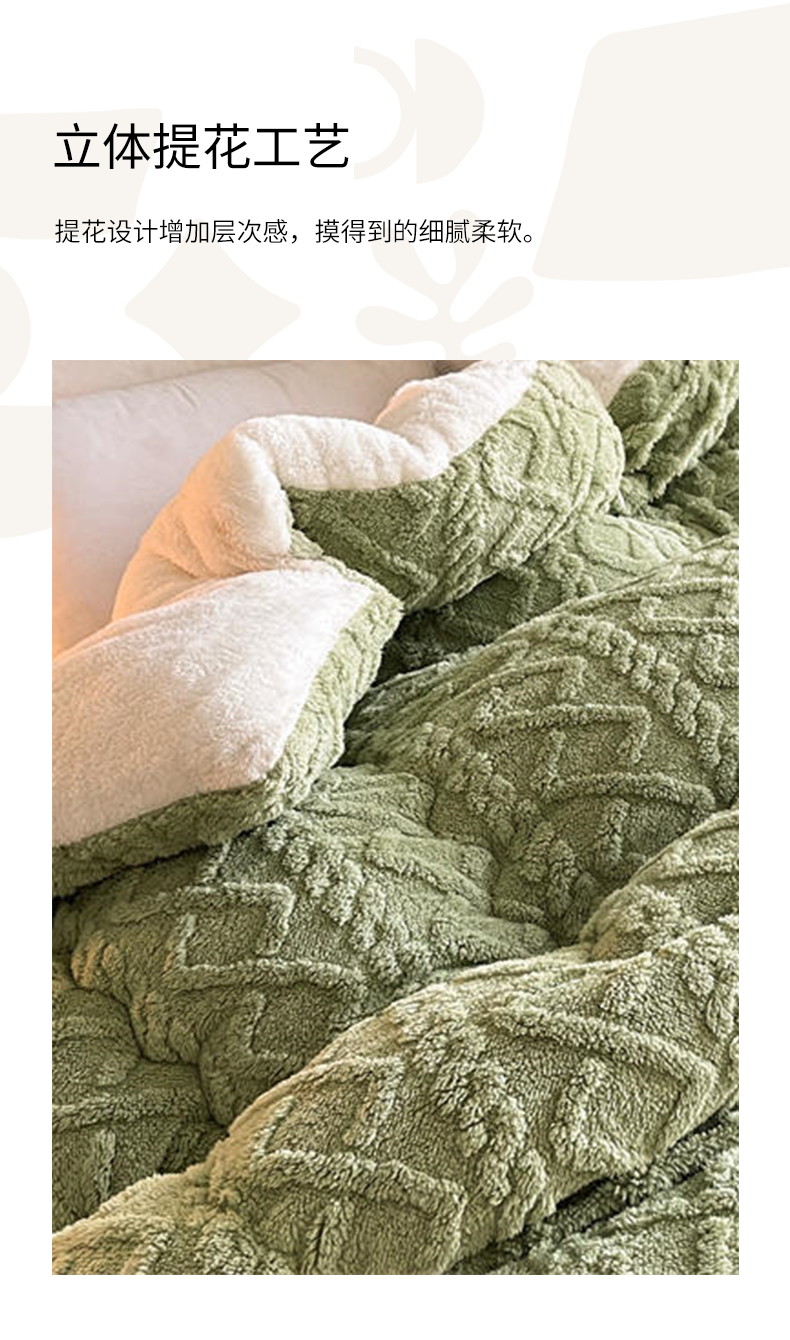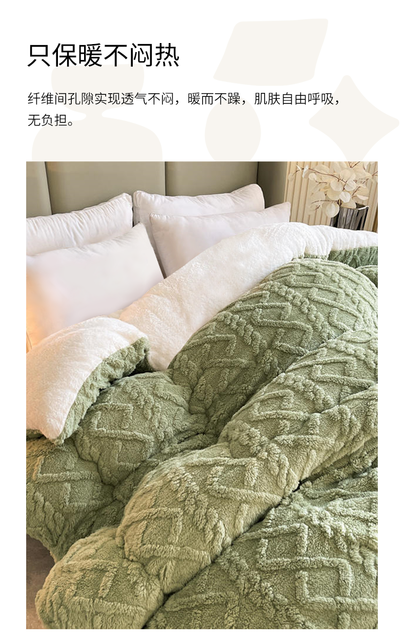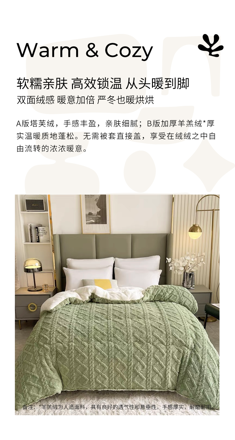 甄選上等羊羔絨,A面塔芙絨 B面羊羔絨,不易掉絨,舒心又省心。如雲朵般溫柔親膚,彷彿置身於冬日暖陽,給予身心自在愜意。面料輕薄柔軟,透氣乾爽,讓身體無負擔,享受輕鬆睡眠,好夢一整晚。自帶暖感,抑菌吸汗,還你舒適安心。