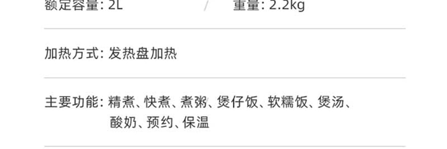特點:聚能鎖熱火力直透米芯,米飯粒粒飽滿軟糯整鍋受熱均勻不夾生,每一口都香甜Q彈2升容量剛剛好,頓頓新鮮不浪費,適合三口之家/小兩口/一人食八大煮食功能 滿足三餐花樣做法 觸控面板操作簡便24小時預約定時,美味到點即享
