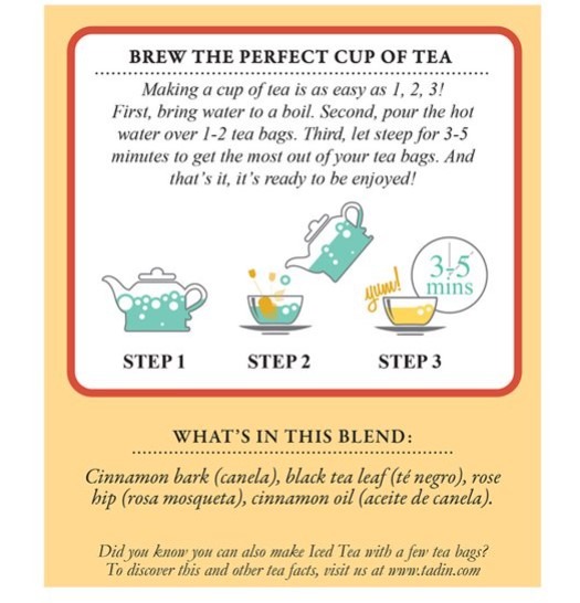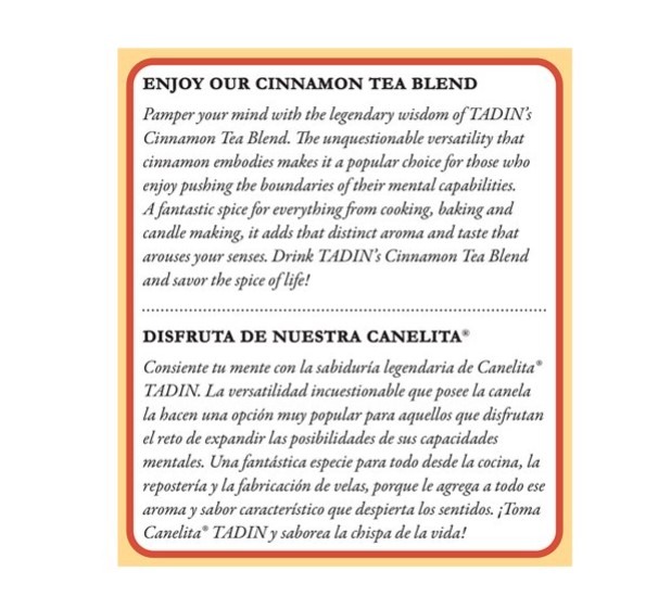 Tadin Tea Canelita or Cinnamon Blend helps those who enjoy pushing the boundaries of their mental capabilities thanks to the versatility that cinnamon embodies. This product contains caffeine for those in need of an alert brain.